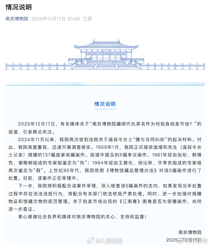 【#南博回应有藏品现身拍卖市场#】#南博将核查5幅争议画作去向# 今天,南京博物院发布情况说明:2025年12月17日,有关媒体关于“南京博物院藏明代仇英名作为何现身拍卖市场?”的报道,引发舆论关注。2024年11月以来,我院两次收到法院关于庞叔令女士“赠与合同纠纷”的起诉材料。对此,我院高度重视,迅速开展调查核实。1959年1月,我院正式接收庞增和先生(庞叔令女士父亲)捐赠的137幅庞家收藏画作。报道中提及的5幅争议画作,1961年经由张珩、韩慎先、谢稚柳组成的专家组鉴定为“伪”;1964年经由王敦化、徐沄秋、许莘农组成的专家组再次鉴定为“假”。上世纪90年代,我院依照《博物馆藏品管理办法》对该5幅画作进行了处置。目前,该案件正在审理中。下一步,我院将积极配合该案件审理,深入核查该5幅画作的去向,如果发现当年处置过程中存在违法违规行为,将配合有关部门依法依规严肃处理。同时,进一步加强对捐赠物品和馆藏文物的规范管理。关于拍卖市场出现的《江南春》图卷是否为受赠画作,尚待进一步查证。网页链接