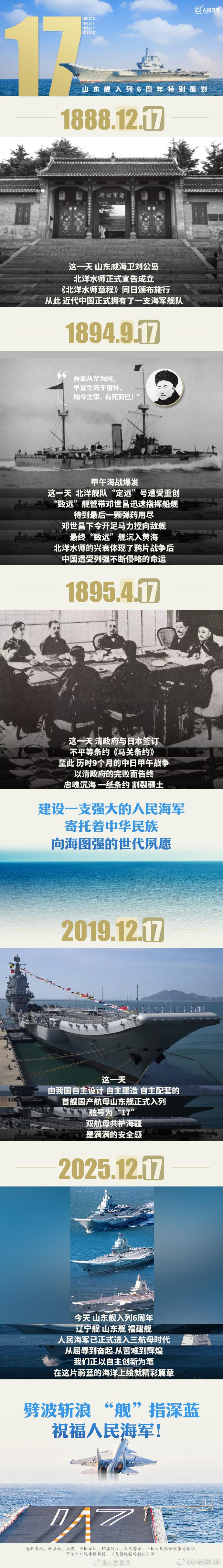 【 舷号17横跨137年的巧合 】1888年12月17日,北洋水师成军;1894年9月17日,甲午海战喋血;1895年4月17日,《马关条约》泣血;2019年12月17日,国产航母山东舰入列!跨越137年,从屈辱的“17日”到奋起的“17号”,历史用同一个数字,见证了一个民族从至暗时刻走向深蓝辉煌。昔日甲午之痛,今朝以“三航母”之姿告慰。山河无恙,国富兵强!今天山东舰正式入列6周年 祝山东舰生日快乐,愿你剑指深蓝,所向披靡!