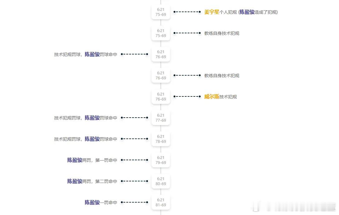 第四节比赛中,北京75-69领先辽宁时,姜宇星打到陈盈骏面部被吹犯规,杨鸣抱怨裁判连吃2T被驱逐。随后威尔斯也抱怨裁判被吹罚技术犯规,因此陈盈骏获得了5次罚球机会。但在陈盈骏执行完5次罚球后,北京80-69领先辽宁,裁判和技术台商讨陈盈骏罚球次数,最终又给了陈盈骏第6次罚球。陈盈骏在造成姜宇星犯规获得2次罚球后,辽宁又连续吃到3次技术犯规,但最终却获得了6次罚球。杨鸣连吃两t被驱逐京辽大战判罚北京男篮vs辽宁男篮CBA