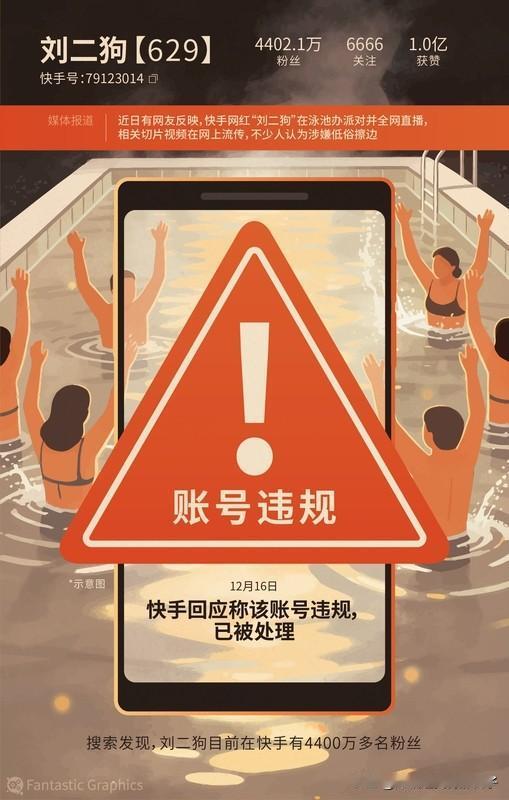 4400万粉丝网红直播泳池派对被处理 4400万粉丝的网红“刘二狗”这次可栽了。12月上旬他办了场泳池派对直播,切片视频在网上疯传。视频里,冒着热气的泳池里一堆男女身着泳装,年轻女子热舞,男主持仅穿泳裤和她们近距离互动,水中嬉闹不断。好多网友都说这衣着暴露,涉嫌低俗擦边,而且他粉丝多,很容易带坏青少年。 12月15日记者向平台反映,16日平台就回应账号违规,禁止他发新作品并督促整改。看来就算粉丝多,也不能在直播里搞这些低俗的内容,得好好规范自己呀。