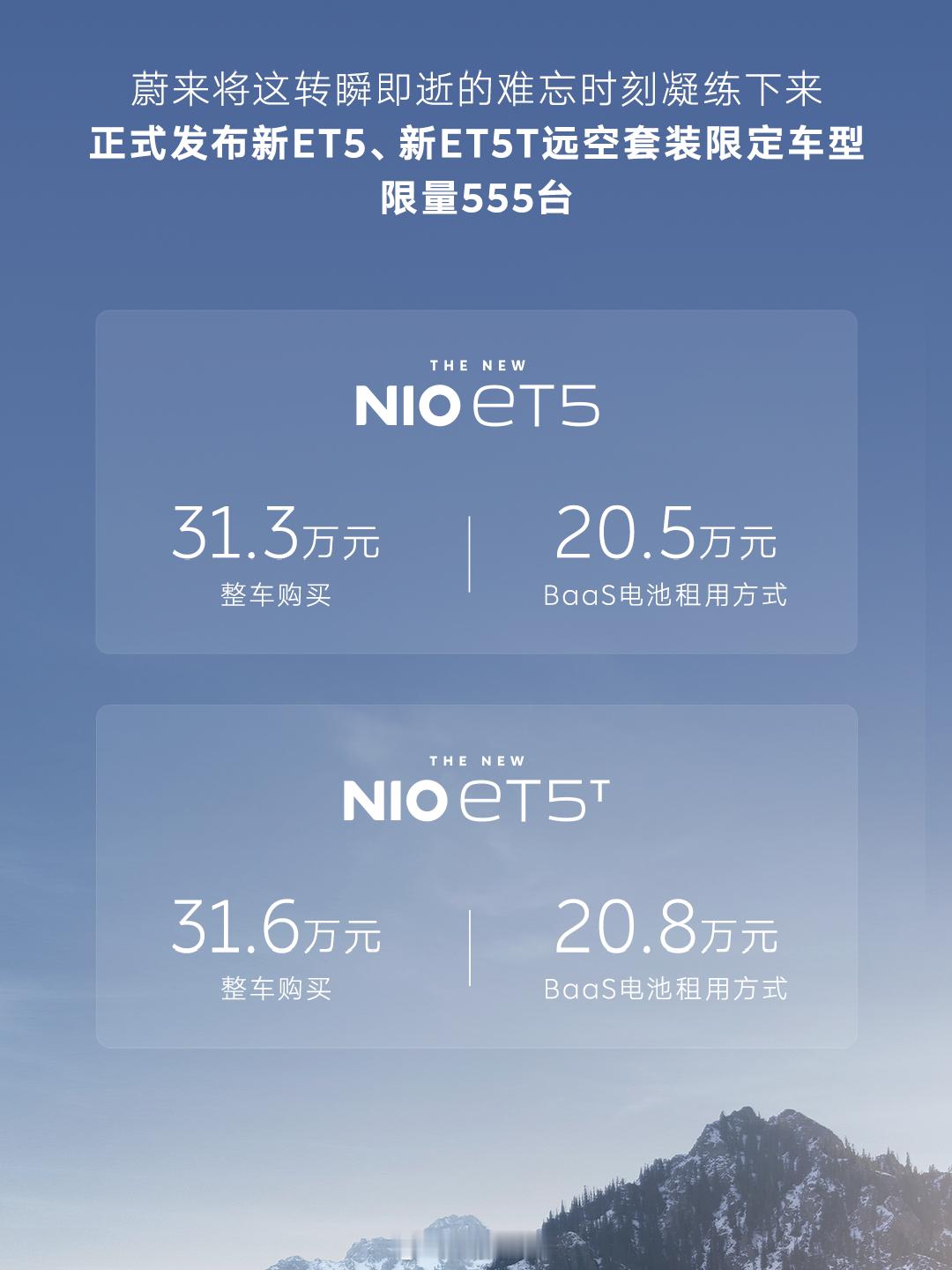 新ET5/ET5T空套装限定车型,限时限量555台上市价20.5万元和20.8万元( BaaS 电池租用)这个远空紫是真的好看,饱和度恰到好处比普通版贵1万多,也挺值的限定版特有的远空紫车身颜色和薄藤紫与电驭紫两种内饰主题,其他的配置如下:三角窗拉花、标配20英寸五辐花轮圈、气门帽芯、定制车顶箱、车顶行李架导轨、车顶箱横杆等等好想去看看冬天的阿勒泰友友们蔚来et5t