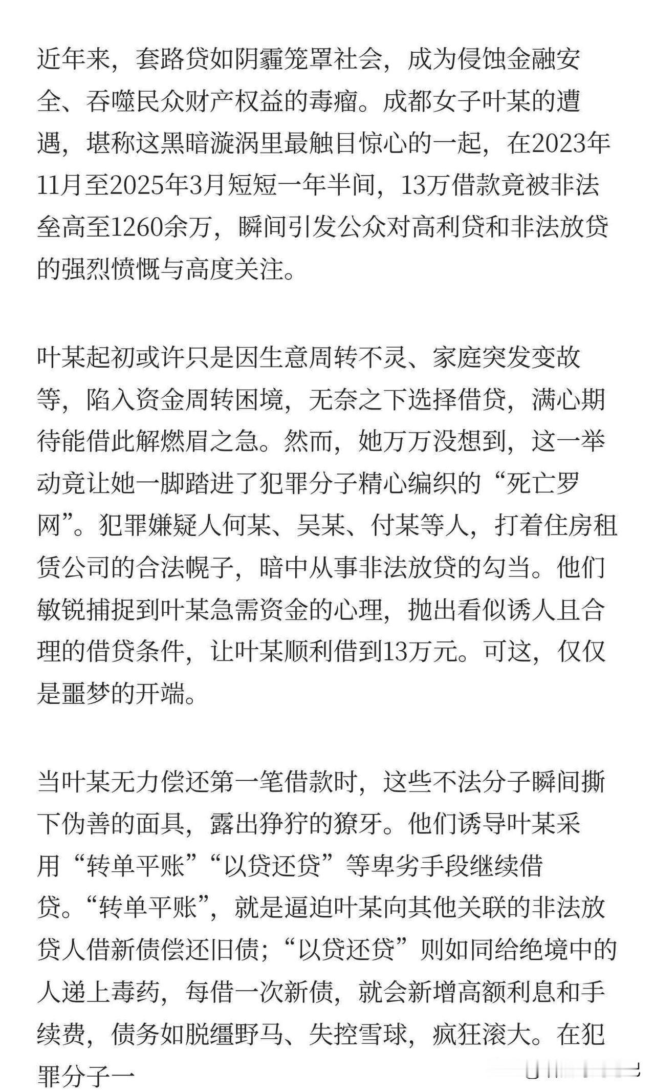一位留学归来的姑娘,从区区13万滑向千万级债坑。 她原本只想小试创业,只贷了13万,扣完杂七杂八的手续费,实际到账只剩8万。 打着“平衡账目”的旗号,她一步步被拖进泥潭,最终连家里的老宅都拱手让人…我们总把这类故事当成遥远传闻。 可现实里,有些深渊并非自己纵身跃下,而是被人暗中推了下去。 所以,别再把锅全甩给“借钱的人贪心”。没有层层嵌套的金融“创新”,哪来百倍杠杆的奇迹? ——🌱—— 📌 个人提醒:看到“秒到账”“零门槛”,先滑到页面最底,把“逾期条款”读三遍;真缺钱了,先去银行问一圈,再打开网贷App。 [图源网络]