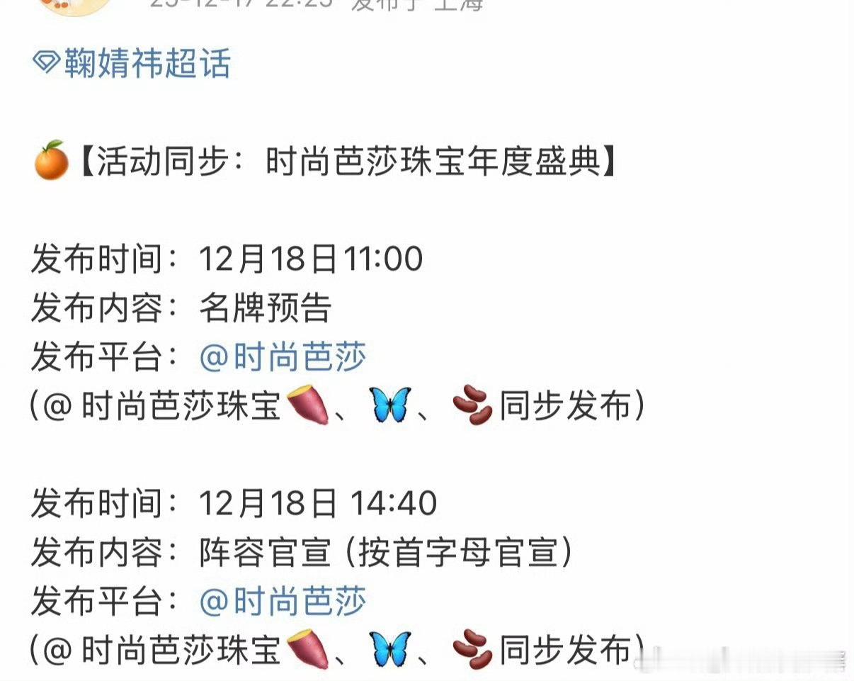 鞠婧祎要出席时尚芭莎珠宝年度盛典