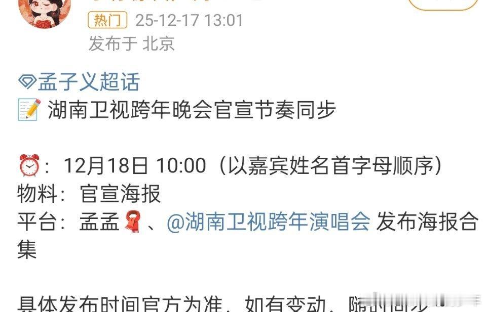 孟子义湖南卫视跨年晚会官宣节奏同步