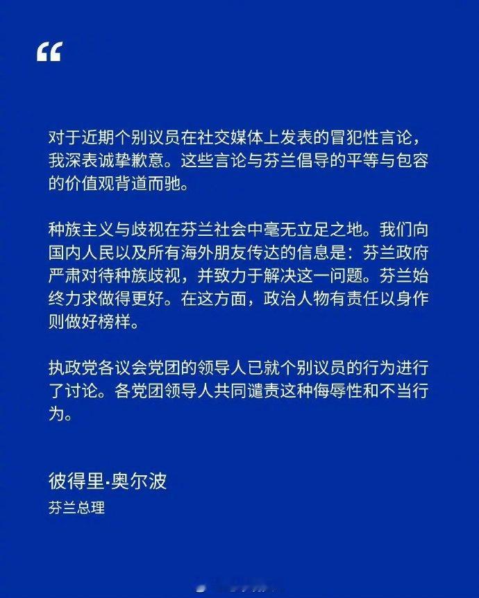 芬兰总理向中韩日民众道歉 在种族歧视议员和官员受到芬兰法律(如果有的话)惩处之前。不应接受这种虚无缥缈的道歉。有关方面还应对这些针对性种族歧视的芬兰议员和官员实施制裁。
