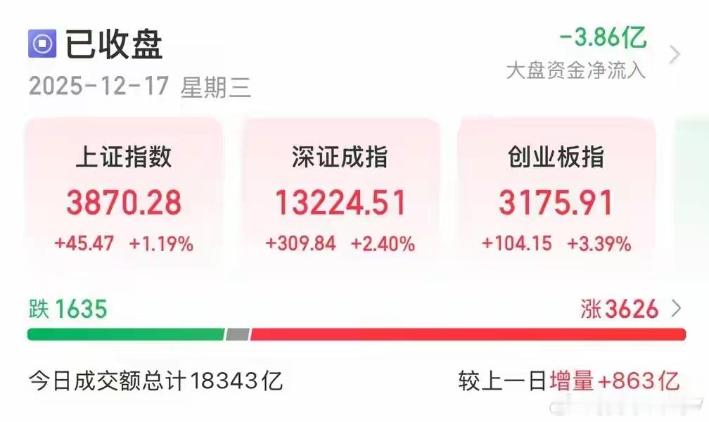 新能源领涨白酒弱势,明日大盘大概率迎调整!12月17日A股探底回升,三大指数集体收涨,两市超3600家个股上涨,赚钱效应显著回升。盘面呈现鲜明分化:新能源、游戏板块强势领涨,白酒、煤炭等少数板块逆势飘绿,而大盘反弹强度超预期背后,暗藏短期调整信号。一、核心板块表现与解读1. 新能源:超跌反弹为主,反转信号未现新能源板块今日强势大涨,盛新锂能冲击涨停,天齐锂业、西藏矿业涨超5%。从走势来看,这是板块调整三个月后的超跌反弹行情,目前尚未出现明确反转信号。短线来看,板块仍有再探昨日低点的可能,甚至不排除盘中跌破的情况,若无突发重大利空,当前仅适合博弈短线机会,不宜盲目追高或长期持有。2. 白酒(消费):弱势震荡待变盘,上行概率偏大以白酒为代表的消费板块表现弱势,属于正常技术面调整。从板块指数来看,今日收出阴十字星,且短线震荡区间持续缩窄,意味着明后天大概率迎来变盘节点。尽管暂时无法精准预判变盘方向,但即便向下调整,空间也相对有限。结合近期重要会议释放的内需支持信号,个人更倾向于往上变盘的几率更大,可耐心等待明确信号后再择机布局。二、大盘走势分析:反弹到位,明日调整概率大今早原本预期仅为5分钟结构的弱反弹,但最终走出30分钟级别反弹,强度超出预期。核心驱动因素是午后多只宽基ETF放量拉升,大概率是国家队出手护盘,为市场提供了流动性支撑。但从短线逻辑来看,大盘反弹已基本到位,明日大概率迎来调整:可能是冲高回落,也可能直接低开调整,最终收跌的概率较大。后续来看,市场有望在周五或下周初向3800点附近寻求支撑,若期间未出现放量下挫的极端情况,将再次迎来短线低吸机会。综合判断明日A股调整的可能性较大,操作上建议以防守为主,严控仓位。对于今日涨幅较大的新能源板块,可趁反弹适当锁定收益;白酒等消费板块则耐心等待变盘信号,不盲目抄底;整体避免追高,静待市场调整到位后,再把握新的短线机会。