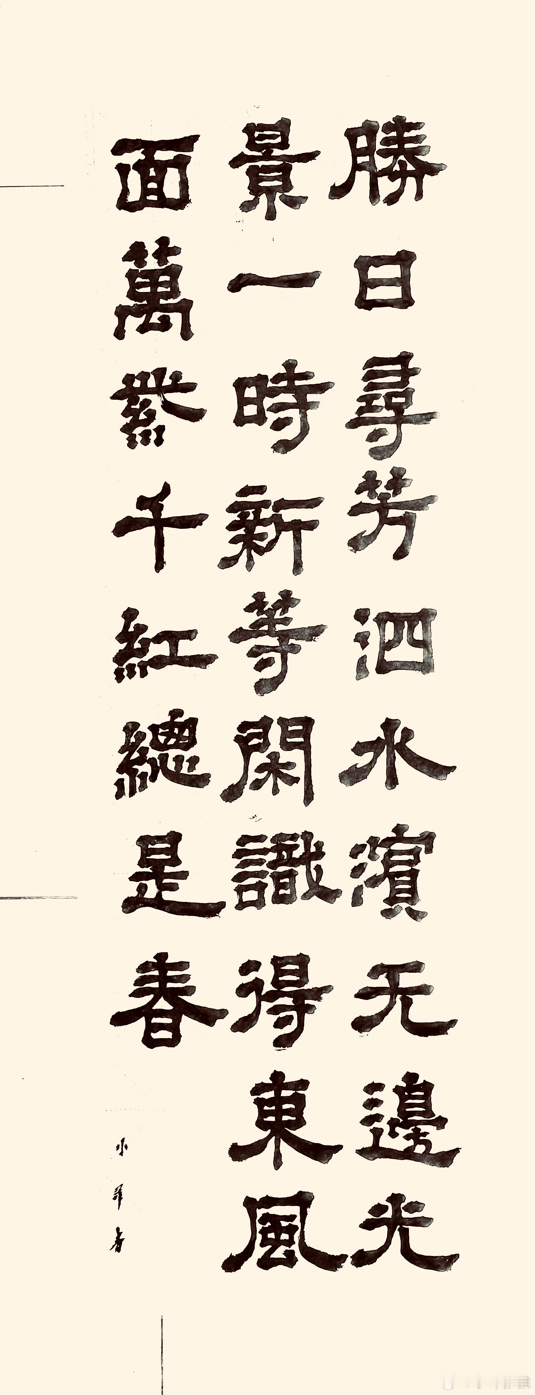 书法 春日(宋.朱熹)胜日寻芳泗水滨,无边光景一时新。等闲识得东风面,万紫千红总是春。 《春日》是一首七言绝句。这首诗表面上是描绘春日美景的咏春诗,但实际上是一首哲理诗。诗人寄寓于“寻芳”的意象,表达了其在乱世之中追求圣人之道的美好愿望。诗中的“无边光景”展现出空间的广阔无垠,暗示了诗人对圣道的膜拜和追索。“东风”暗喻教化,“万紫千红”则比喻孔学的丰富多彩。诗中将圣人之道比作催发生机、“点燃”万物的春风,令人感叹其构思之奇妙。全诗寓理趣于生动的形象之中,以高超的笔法将哲理巧妙地融入诗句,不露痕迹,生动自然。