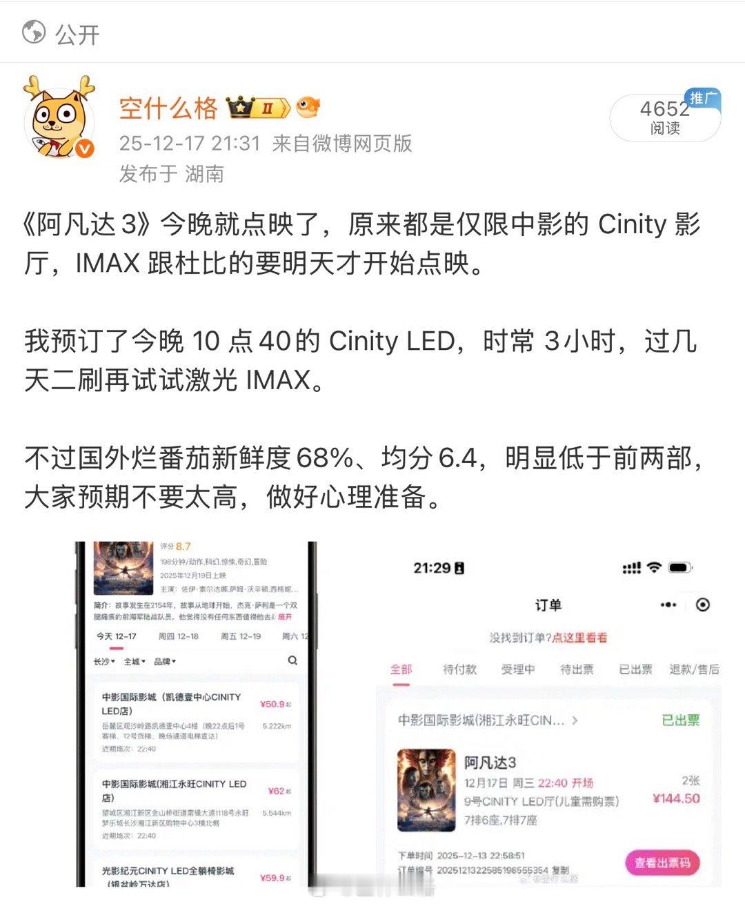 刚看完了《阿凡达 3》,这部其实叫《阿凡达2 下》更好,标题的火与烬元素真心太少,剧情硬伤也更多,结尾留了悬念反派到底死没死。当然视觉特效还是顶尖的,冲着这特效绝对也值回票价。这次看的是 Cinity LED 效果出奇的好,4K 观影体验很赞,改天二刷再看看激光 IMAX。