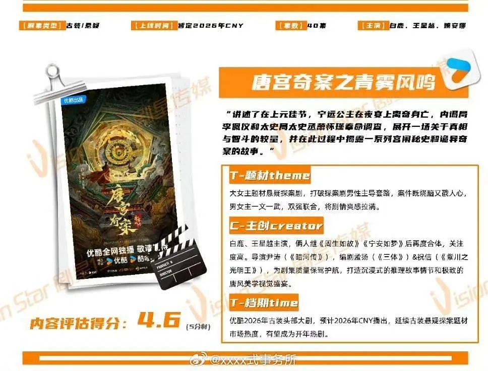 白鹿的两部待播剧《唐宫奇案》和《莫离》都有动静了🤔《莫离》海外Disney版权已卖出,未播先红《唐宫奇案之青雾风鸣》已开启招商,预计明年春节档。大女主题材悬疑探案。