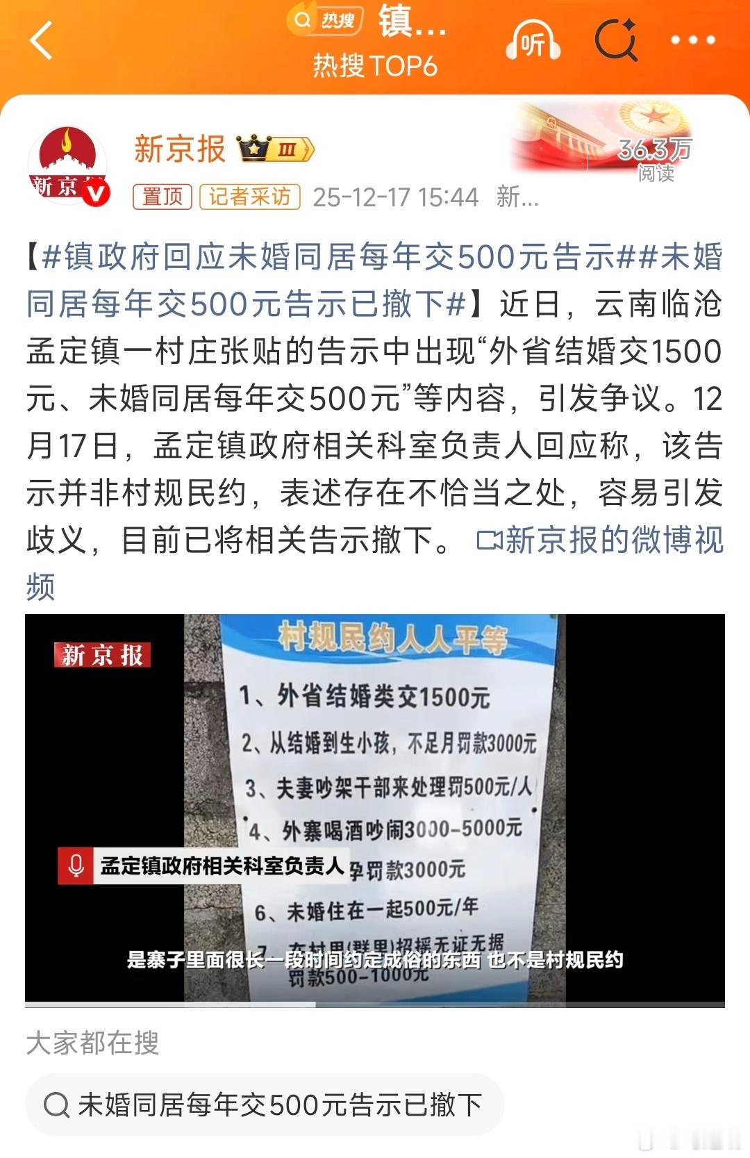 镇政府回应未婚同居每年交500元告示未婚同居每年交500元告示已撤下外省结婚交1500元、未婚同居每年交500元,夫妻吵架干部来处理500元……告示撤了。这家镇政府“服务”很到位。