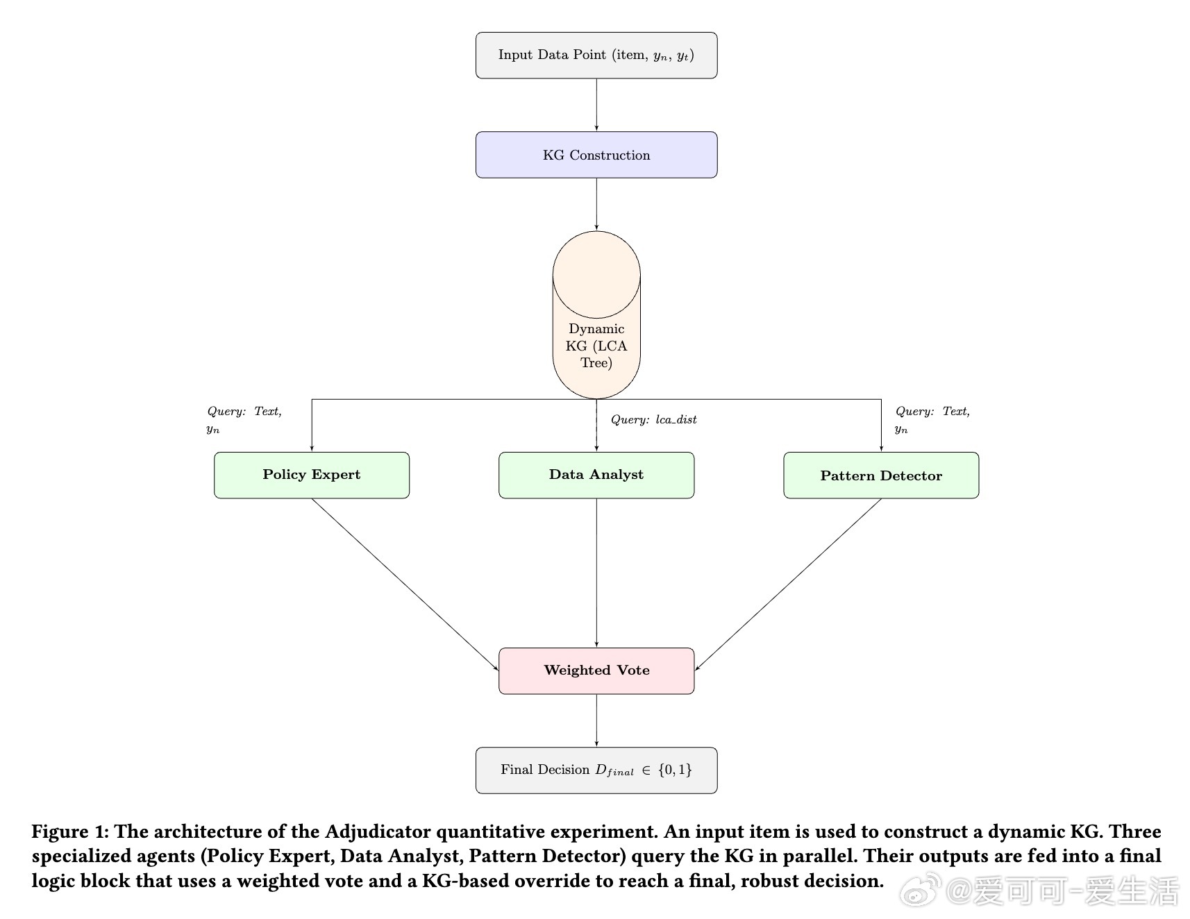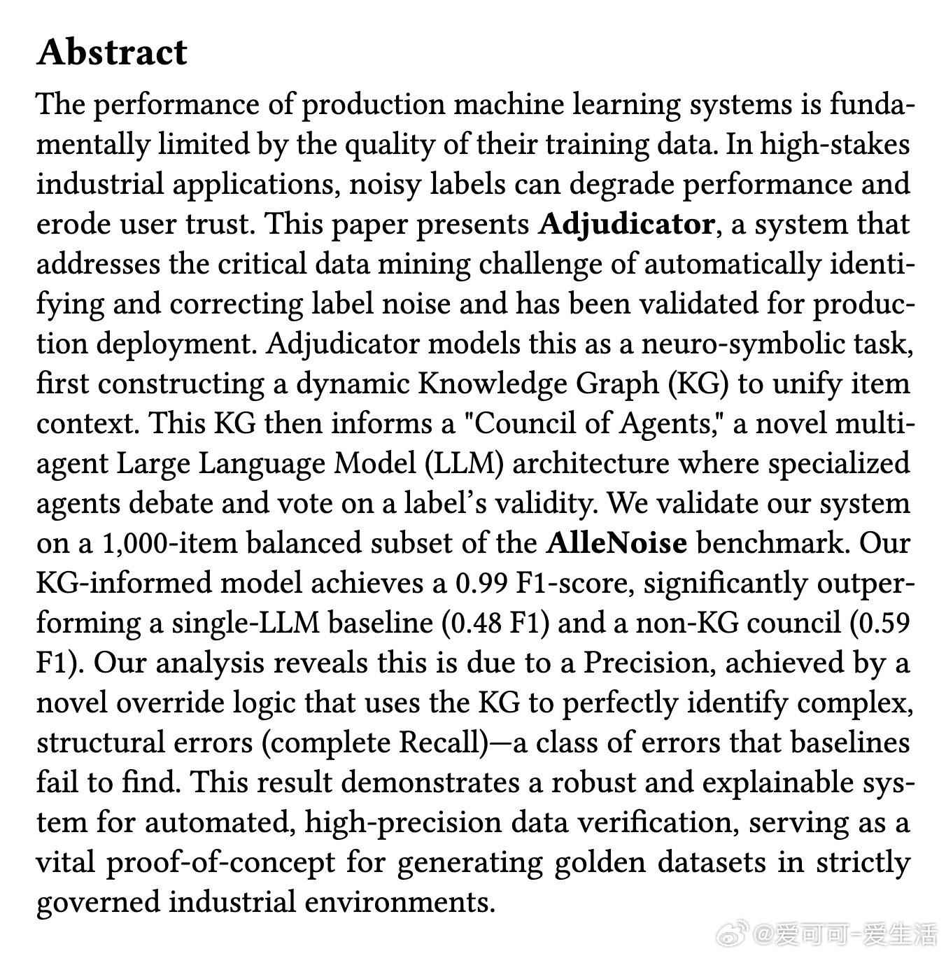 [AI]《Adjudicator: Correcting Noisy Labels with a KG-Informed Council of LLM Agents》D You, S Paul [Google] (2025) 在工业级机器学习应用中,训练数据的质量至关重要。标签噪声不仅影响模型性能,更会削弱用户信任。本文提出了一套创新的神经符号系统——Adjudicator,专门针对自动识别和纠正标签噪声问题进行了系统设计和生产验证。核心创新点在于:1. 知识图谱(KG)构建:为每个数据样本动态构建面向领域的知识图谱,将文本、元数据、用户历史及政策层级等多源信息结构化,形成可查询的符号推理基础。2. 多智能体LLM议会:引入了“议会”机制,由三个具备不同专长的LLM智能体组成——政策专家、数据分析师和模式识别者。每个智能体基于知识图谱提取的上下文独立投票,最终通过加权投票及结构化覆盖逻辑决断标签是否有误。3. 层级祖先距离(HAD)指标:创新地利用图结构的最低公共祖先距离,量化类别路径间的语义和结构差异,成为判别复杂语义错误的关键特征。实验部分,在AlleNoise电商产品数据集的1000条平衡样本(500正确标签,500错误标签)上,Adjudicator实现了惊人的0.99 F1分数,远超单一LLM(0.48 F1)和无KG多智能体议会(0.59 F1)。尤其值得一提的是,系统实现了100%精确率和98%召回率,零误报,完美捕获了语义结构复杂的标签错误,展现出神经符号融合的强大威力。更重要的,基于BugsRepo软件缺陷报告的案例研究显示,Adjudicator能在多轮交互和复杂对话语境中准确甄别错误决策,支持工业生产环境中的实际部署。该研究不仅验证了结合知识图谱与多智能体LLM进行高精度数据清洗的可行性,也为生成“黄金数据集”提供了坚实技术基础。面对高成本的标签校验和严重的语义噪声,Adjudicator展现了前所未有的自动化与可信赖性。当然,系统依赖于高质量的知识图谱构建,且多智能体架构带来了4倍左右的计算开销,未来工作可着重优化权重调节以提升对细粒度层级错误的捕获,同时探索更大规模图谱和动态智能体选取策略。总结一句话:精准、可解释、基于知识图谱与多智能体辩论的Adjudicator,为工业AI数据质量管理树立了新标杆,推动了数据中心AI向更高层次演进。论文链接:arxiv.org/abs/2512.13704