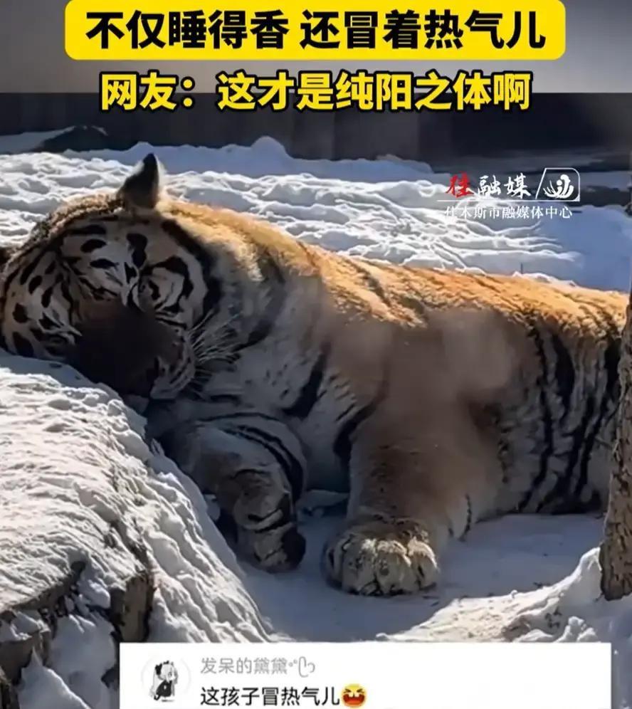 牡丹江一女子逛虎园,随手拍下东北虎在零下十几度的雪地里呼呼大睡,背脊还冒白汽,像