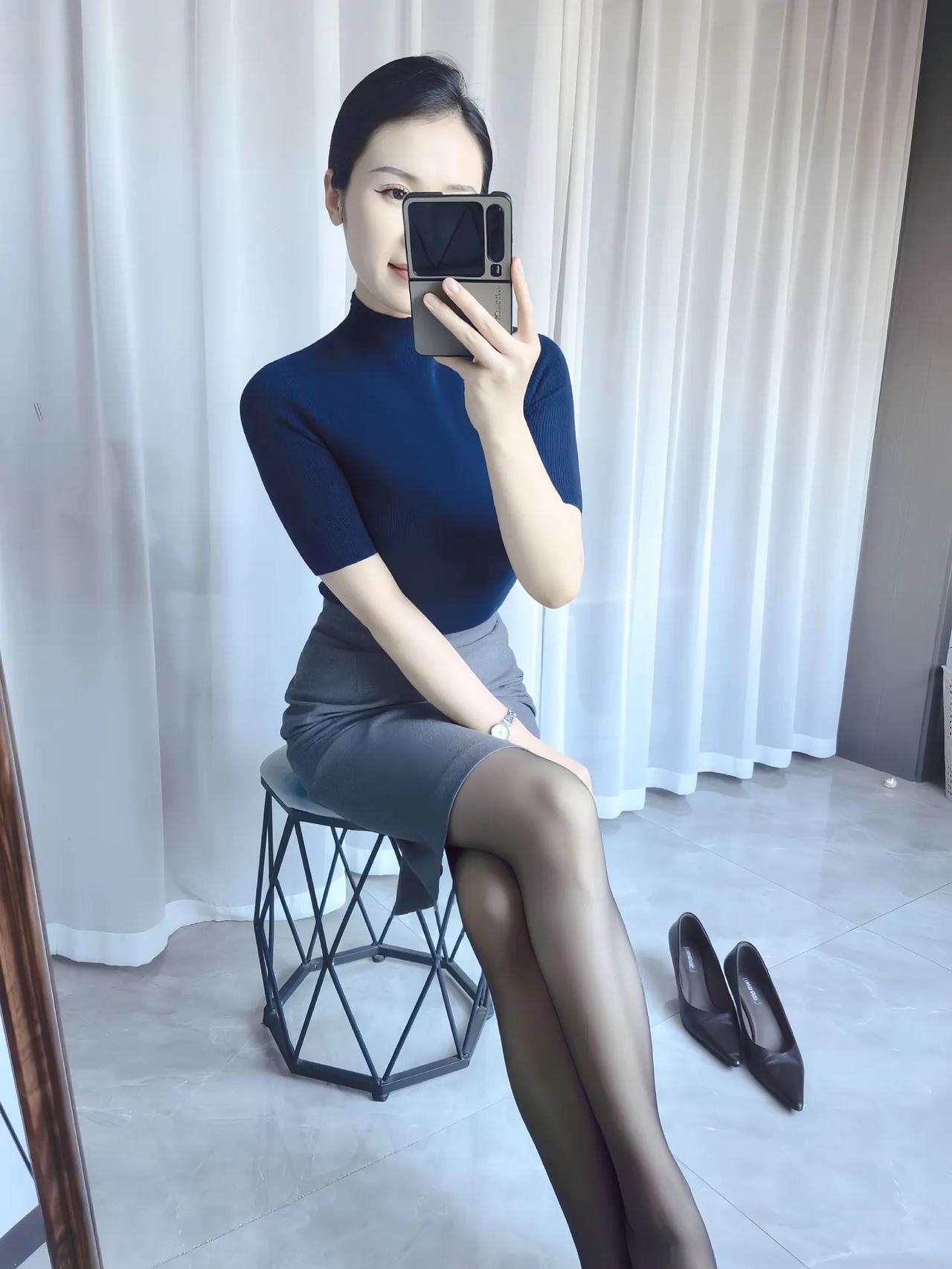 优雅职场穿搭,蓝色高领衫搭配灰色短裙,尽显干练气质!