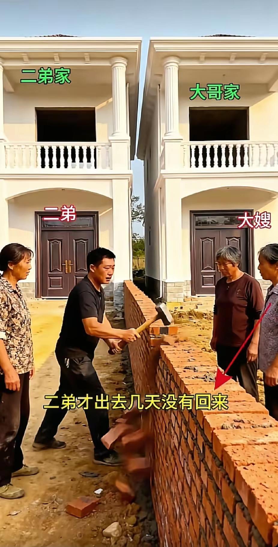 兄弟因一堵围墙反目!二弟外出几日,大哥砌墙越界引发冲突 二弟出门办事不过短短几日,等他匆忙赶回家,院子里的景象令他瞬间怒火冲天——大哥大嫂竟趁着他不在,找人在院子里筑起了一堵围墙。 这堵墙并未砌在院子正中,而是紧挨着二弟的房屋边缘,将原本共同使用的院落强行分隔出一块。二弟见此情景,二话没说,转身抄起一把大锤,朝着新砌的围墙猛砸过去。在砖石的碎裂声中,他怒目圆睁,对着大哥吼道:“你太过分了!就算要砌墙分家,也该砌在院子中间,凭啥把墙砌到我房子这边来?” 大哥看着被砸毁的围墙,也火冒三丈,两人各持己见,争吵不止。原本手足情深的兄弟俩,就因为这堵位置不妥的围墙,彻底闹得水火不容,往日的兄弟情分也在这场冲突中摇摇欲坠。