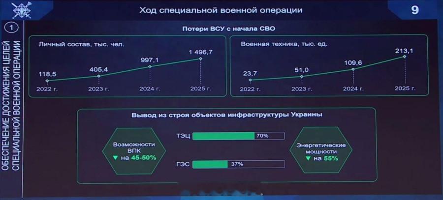 俄乌冲突 俄国防部长别洛乌索夫在国防部扩大会议上的报告要点:,俄罗斯军队保持着战略主动权,几乎在所有方向上都在发起进攻。“东方”“中央” 和 “西方” 集群的进攻速度较 2024 年提高了 1.5 到 2 倍。在别尔哥罗德州、库尔斯克州、布良斯克州已排除了超过 15 万平方公里土地的地雷。俄军控制红利曼后,为封锁斯拉维扬斯克 —— 乌克兰武装部队重要的后勤中心 —— 开辟了道路。夺取库皮扬斯克将扩大哈尔科夫州的 “安全区”,减少对卢甘斯克人民共和国的炮击威胁。俄罗斯军队解放了红军城 —— 这里是乌克兰军队和西方幕后操纵者抵抗的象征。自11月以来,俄罗斯军队在扎波罗热州和第聂伯罗彼得罗夫斯克州解放了 24 个居民点和 400 平方公里土地。古利亚伊波列的解放工作仍在继续,夺取该地区将为解放整个扎波罗热创造条件。解放季米特罗夫卡和红军城将成为乌克兰武装部队近期在顿巴斯遭受的最大失败。2025 年,乌克兰的武装力量(不可逆)损失了近50万名军人。乌克兰武装部队损失了超过 10.3 万件武器,其中包括 5500 件西方制造的武器,这一数字是 2024 年的 2 倍。乌克兰的能源设施产能下降了一半以上:超过 70% 的热电站、超过 37% 的水电站已无法运行。军队中正在引入 “汇总” 系统,从排到部队的各级军官将处于统一的受保护信息空间中。必须在 2026 年 9 月前向所有军队集团推广 “汇总” 系统。特别重视战略核力量的发展 —— 这是遏制对俄罗斯联邦侵略的关键要素。今年,“波扎尔斯基公爵” 号核潜艇已编入海军核力量,该潜艇配备了 “布拉瓦” 导弹。首个装备 S-500 防空导弹系统的兵团已进入战斗值班,该系统能够打击近地空间目标。附俄国防部昨天发布的统计图表:自特别军事行动开始以来至今乌军人员不可逆损失:149.67万。军事装备损失:21.3万件。军工能力损失:45%-50%之间。热电厂损失:70%水电站损失:37%俄方称英法德准备加强对华关系特朗普给乌克兰下达最后通牒