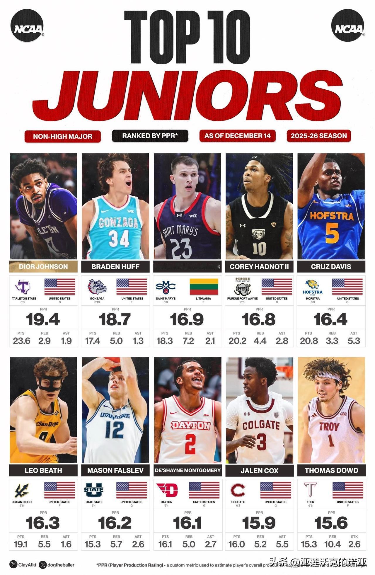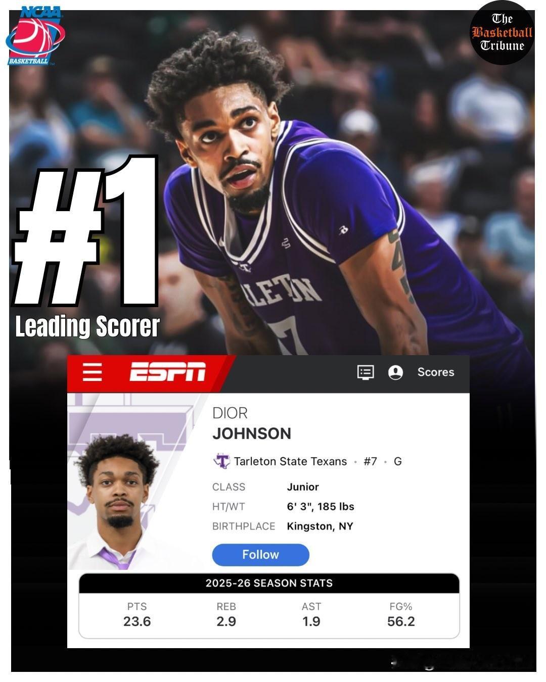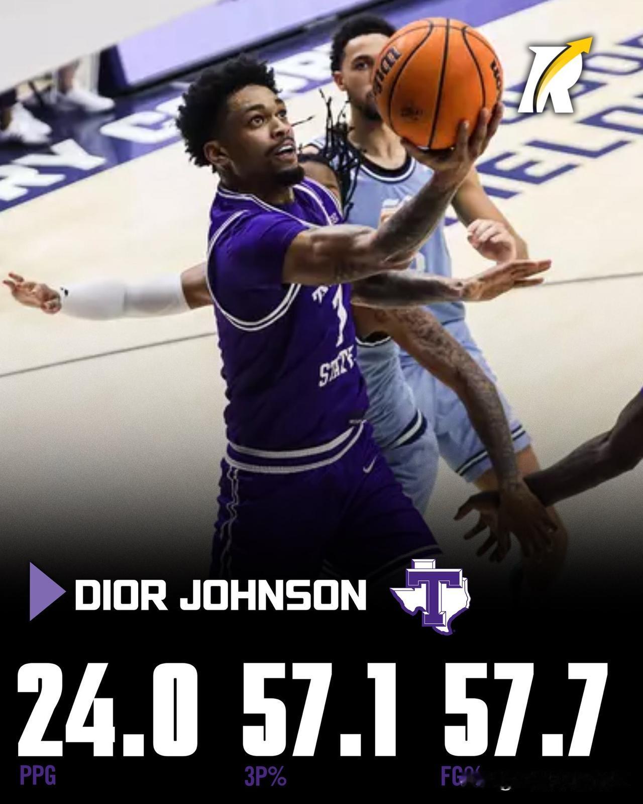 大三控卫Dior Johnson继续展现得分天赋,场均得到24分应该排在全美第一,三分球命中率57.1%,投篮命中率57.7%,之前对阵贝勒大学单场42分创造Tarleton State塔尔顿州立D1时代单场得分记录,继续下去打WAC联盟内战感觉砍50分都正常,明年休赛期估计又要转学了。