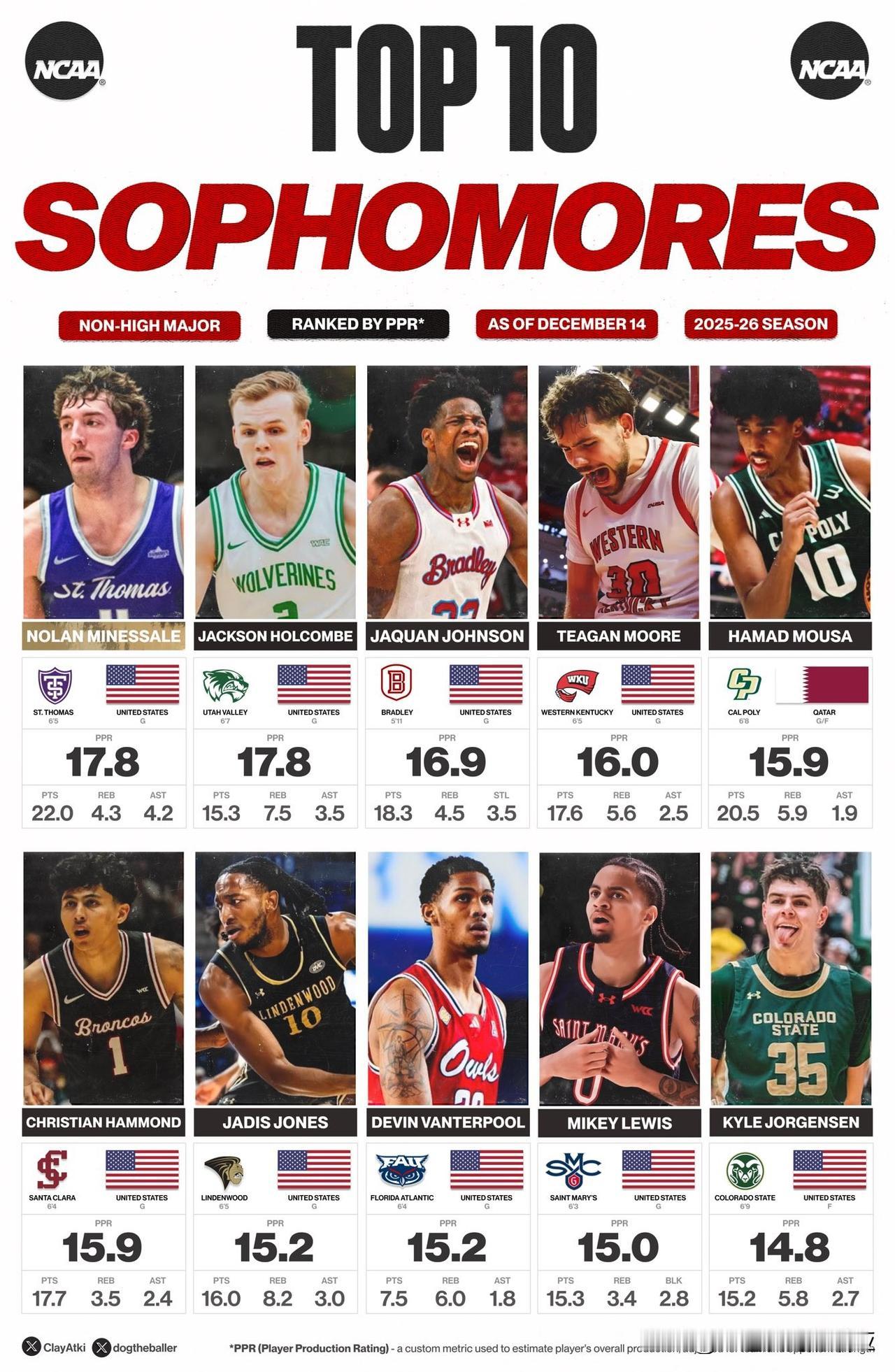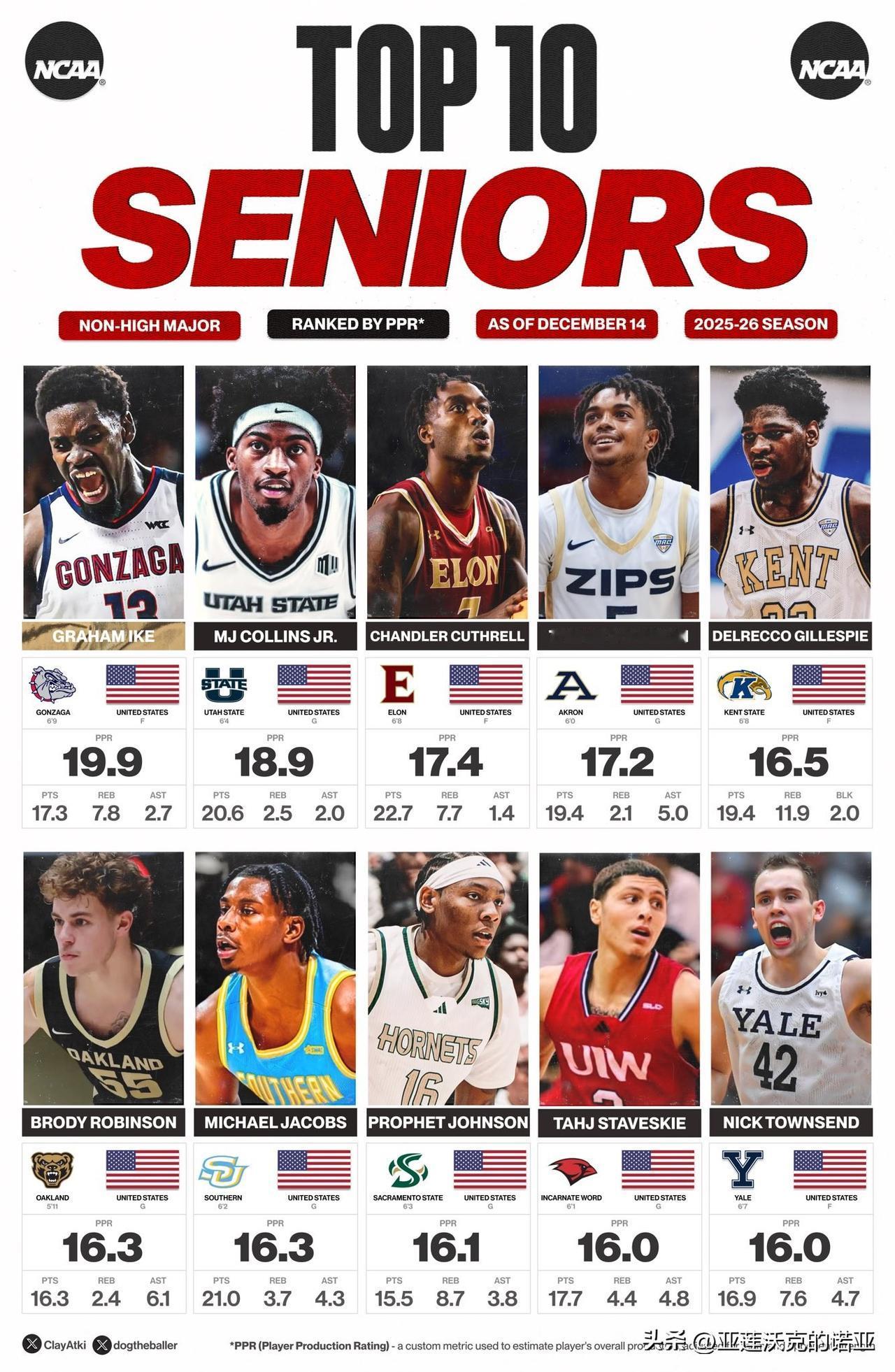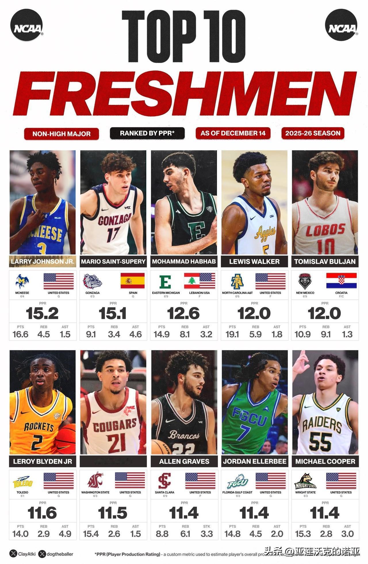 大三控卫Dior Johnson继续展现得分天赋,场均得到24分应该排在全美第一,三分球命中率57.1%,投篮命中率57.7%,之前对阵贝勒大学单场42分创造Tarleton State塔尔顿州立D1时代单场得分记录,继续下去打WAC联盟内战感觉砍50分都正常,明年休赛期估计又要转学了。