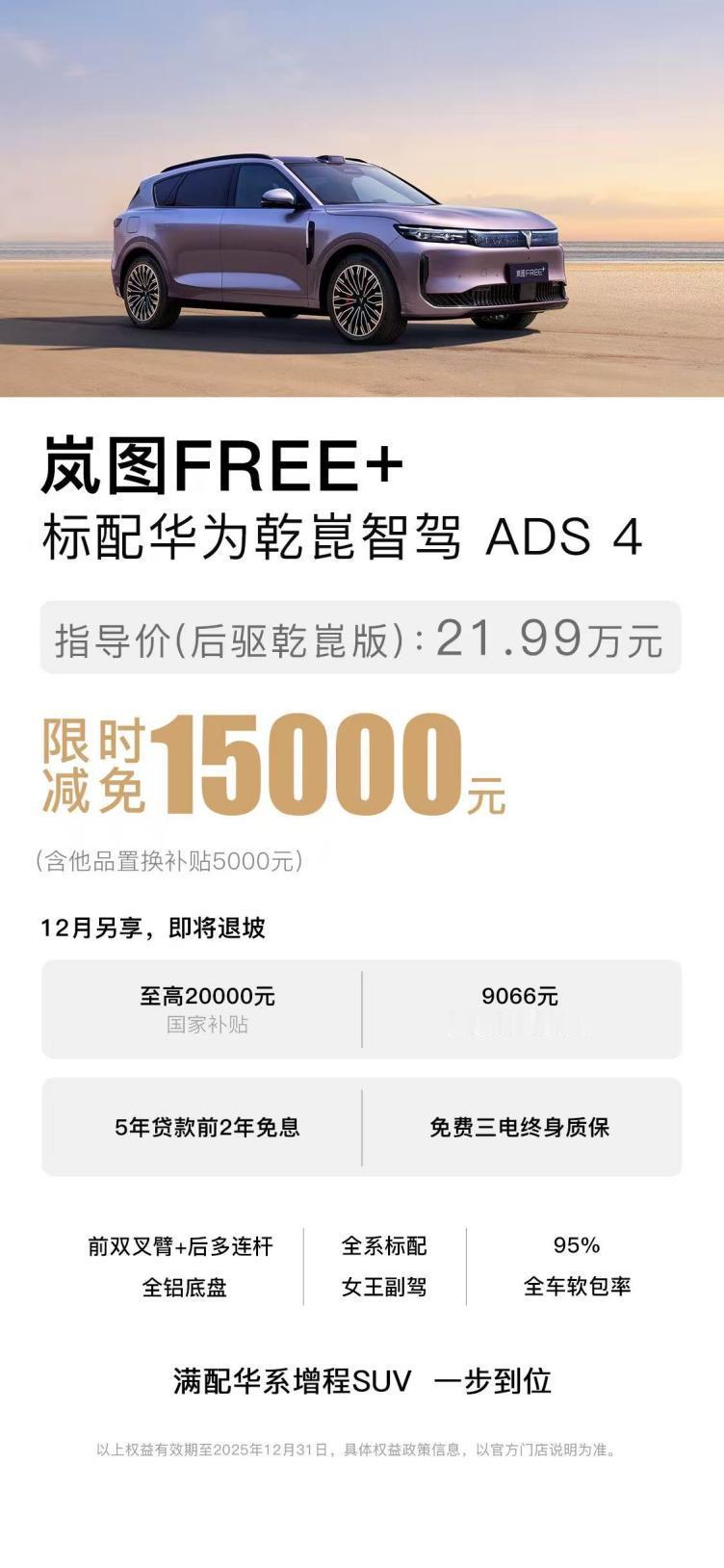 汽车资讯 随着2026年新能源购置税减免政策调整临近,明年购车成本预计将有所上涨。近期岚图汽车推出限时权益:12月31日前下单可立减15000元(含置换),并附赠多项配置升级。根据工信部政策,2026年1月1日起,新能源汽车购置税将从全额免征调整为减半征收,单车最高减免不超过1.5万元。这意味着消费者若在明年购车,可能需要多支出数千至上万元的购置税。此次岚图FREE+在优惠期间还提供价值38000元的配置升级,包括华为乾崑智驾ADS高阶功能包抵用券、四活塞运动卡钳、双头枕音响、四门电吸门等装备,并赠送终身每月10G车机流量。该车型全系搭载华为乾崑智驾ADS 4与鸿蒙座舱5,在智能驾驶与驾控体验方面具备相应配置。对于近期有购车计划的消费者而言,赶在政策调整前入手,或可节省部分购置成本。