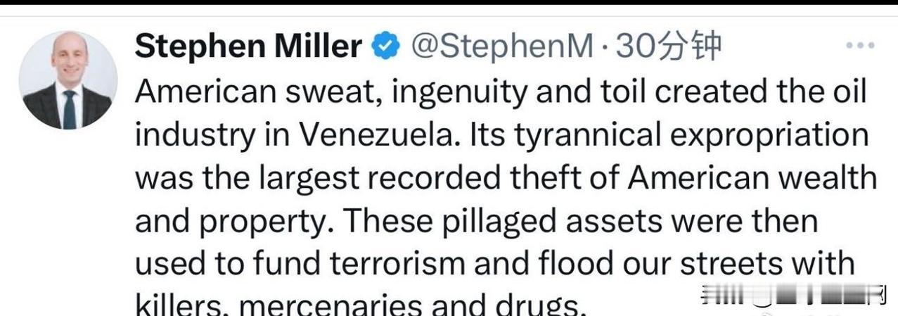 委内瑞拉的石油家底,本来就是美国公司花钱、花技术一步步做起来的。 2007年查韦斯一句国有化,直接把埃克森美孚、康菲这些公司的资产拿走,补偿还严重缩水。后来国际仲裁,美国公司赢了,赔了几十亿美元,这就是赤裸裸的“强行没收”。 这些被抢走的石油资源,后来一直被马杜罗政权用着。与此同时,美国司法部在2020年正式起诉马杜罗是“毒品恐怖主义”头目,指控他和FARC勾结,长期往美国输送毒品,害得美国社会问题不断加重。 一边用着美国人打下的家底,一边反过来危害美国安全,这种“忘恩负义”才是问题的核心。 米勒说得很直,川普政府现在对受制裁油轮的封锁、扣押和强硬施压,本质上就是迟来的清算。