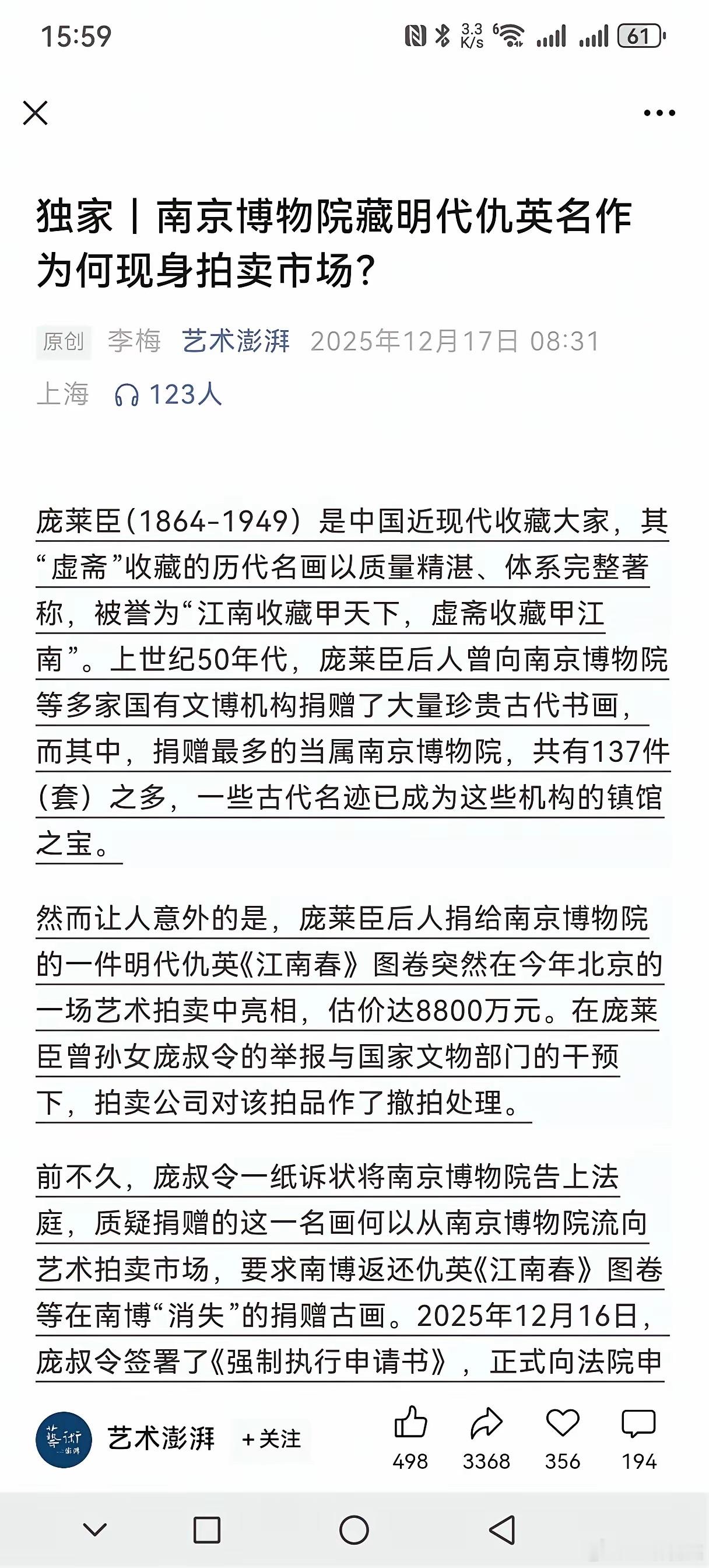 到底是博物院管理不善,还是监守自盗?作为全国十大博物院之一的南京博物院,别人捐赠了七十多年的文物,竟然堂而皇之的出现在了拍卖会上,被人标价8800万公开拍卖,简直是滑天下之大稽!现在捐赠人的后人找上门来,博物院也是一推三六五,彻底摆烂,反而诬陷别人捐赠的是赝品,早就被处理了,又拿不出确凿的证据来,这样的说法如何服众?南京博物院文物博物馆书画8800万书画