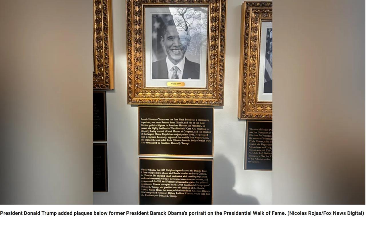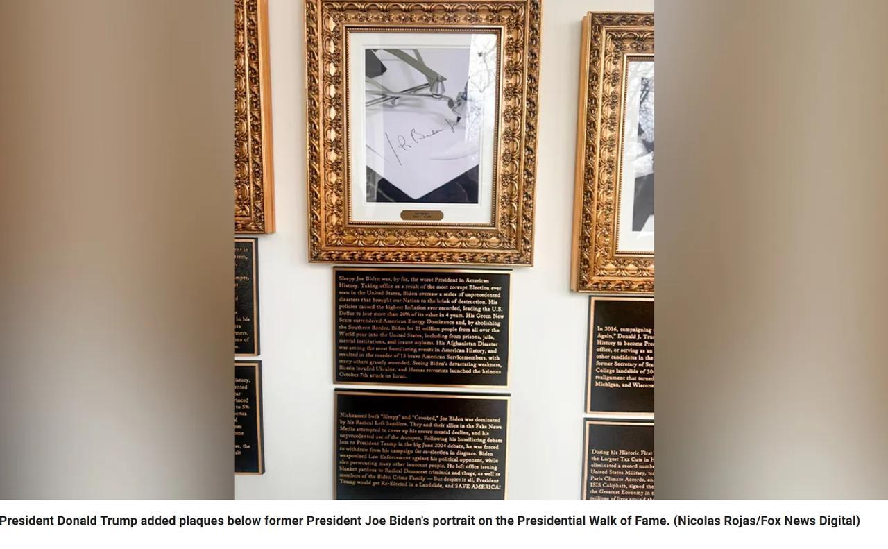 特朗普又整活:在白宫前总统肖像下增添牌匾嘲讽拜登和奥巴马 特朗普通过在白宫总统肖像下方安装了新的纪念牌,对他的前任们进行了明显的讽刺。 特朗普在九月份使用自动笔的照片来代表乔·拜登,现在又添加两块牌匾对拜登进行嘲讽,顶端的铭牌写着:“睡觉乔·拜登是美国历史上迄今为止最糟糕的总统。拜登领导了一系列前所未有的灾难,将我们的国家推向毁灭的边缘。他的政策导致有史以来最高的通胀,导致美元在4年内贬值超过20%。” 第二块牌匾写道:“乔·拜登既被昵称为'困倦'也被称为'歪斜',他被激进左翼的幕僚主导。他们和假新闻媒体的盟友试图掩盖他严重的精神衰退和他前所未有的自动笔使用,在2024年6月大辩论中羞辱性地输给特朗普总统后,他被迫羞愧地退出连任竞选。” 特朗普还讽刺了前总统巴拉克·奥巴马,称他是“美国历史上最具分裂性的政治人物之一”。 一块牌匾写着:“作为总统,他通过了极其无效的'负担不起'医疗法案,导致他的政党失去了国会两院的控制权,并产生了自1946年以来最大的众议院共和党多数。” 第二块铭牌写道:“奥巴马还监视了唐纳德·J·特朗普2016年总统竞选活动,并主持了'俄罗斯-俄罗斯骗局'的制造,这是美国历史上最严重的政治丑闻。他亲自挑选的继任者希拉里·罗德姆·克林顿随后将失去总统宝座,输给了唐纳德·J·特朗普。” 尽管希拉里·克林顿从未成为总统,因此也未出现在总统星光大道上,但她被多次提及。 在前总统比尔·克林顿的照片下方,一块牌匾写着:“2016年,克林顿总统的妻子希拉里·克林顿输给了唐纳德·J·特朗普总统!”