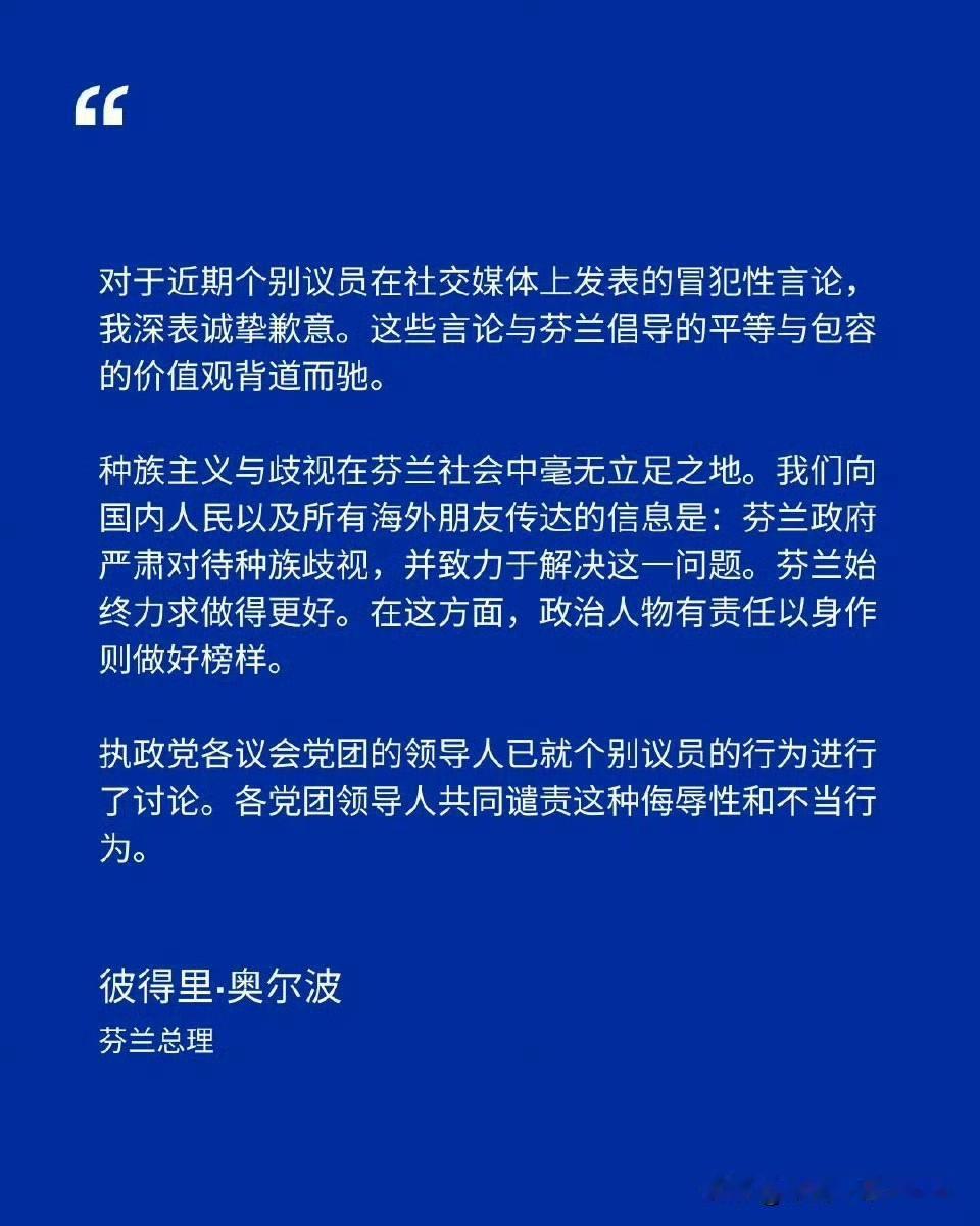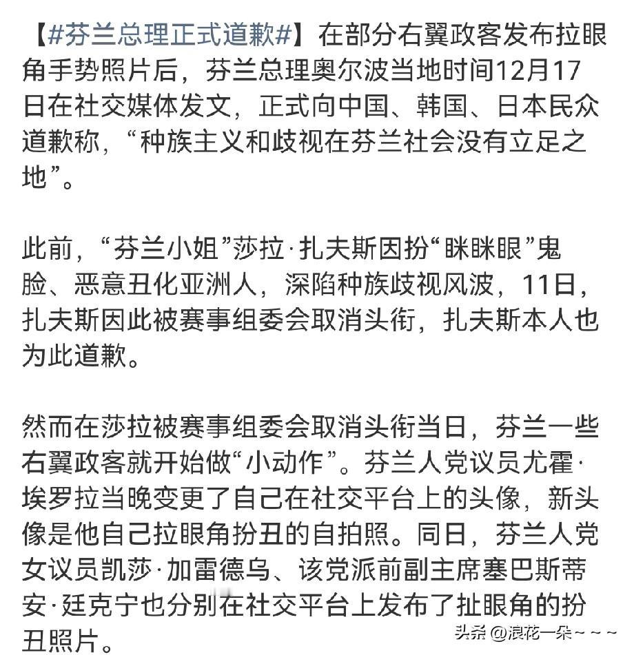 道歉!认错! 芬兰总理,扛不住了? 是的,的确扛不住了!芬兰总理出面向亚洲人进行道歉,要求大家不要再进行种族歧视,特别是个别不守规矩的议员们更要带好头,以身作则! 否则的话,整个亚洲人对抗鄙视芬兰的话,芬兰这么小的一个国家怎么能够受得了啊?扎夫斯以及个别议员这种种族歧视行为已经严重影响了芬兰人在世界人面前的形象。以后亚洲人谁还去你们那里旅游消费啊? 俗话说,一颗老鼠屎坏了一个汤,这个“芬兰小姐”扎夫斯真是给芬兰总理惹了一身骚!