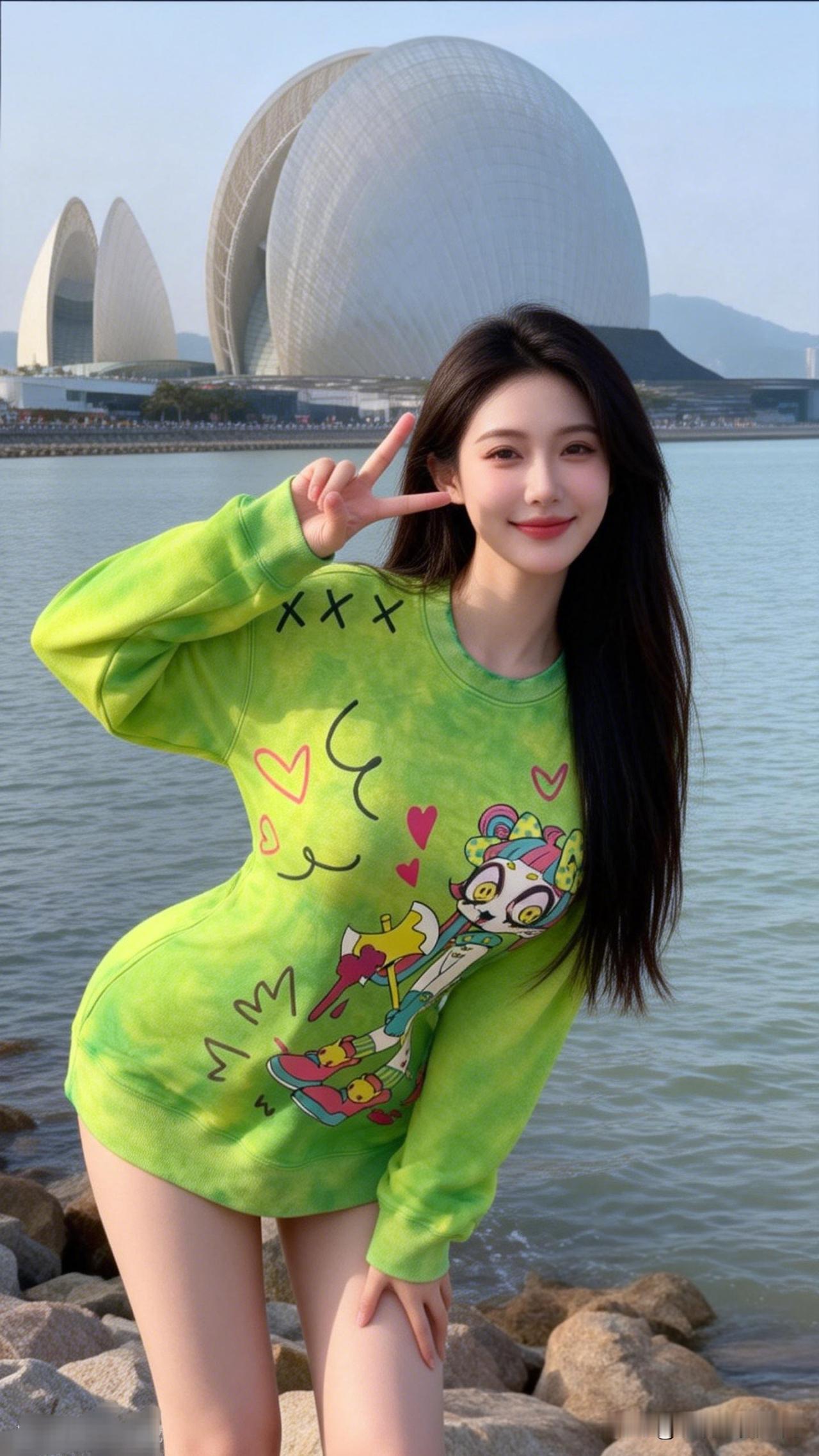 碧波荡漾,绿衫美人。分享唯美照片 元气少女在海边打卡,背景是梦幻的贝壳建筑!🌊💚💕