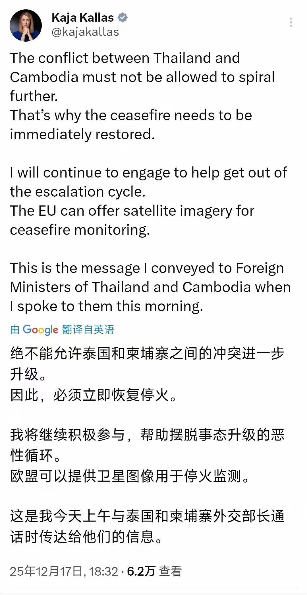 卡拉斯发文要求泰柬必须立即停火!真把自己当成“救世主”了吗?还是管管好自己欧盟的事务吧。亚洲的事情亚洲国家自己会处理好的。 网友:真把自己当颗葱了哦!