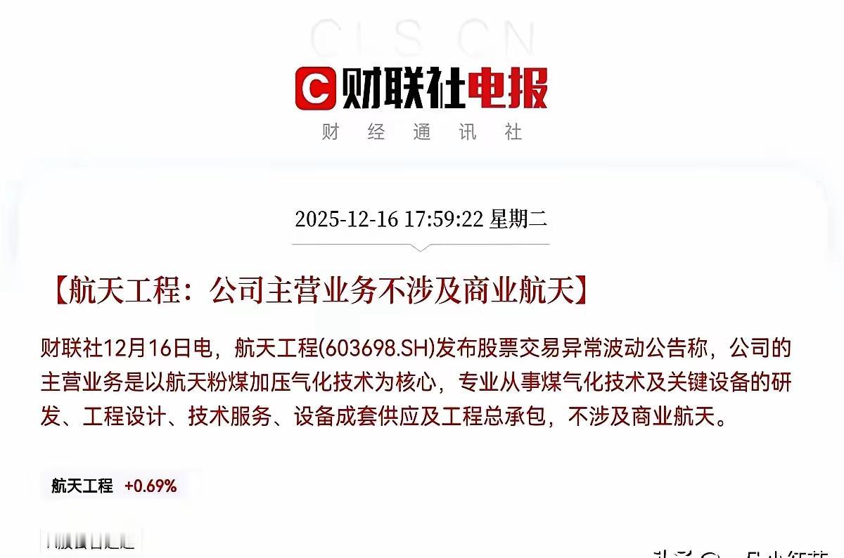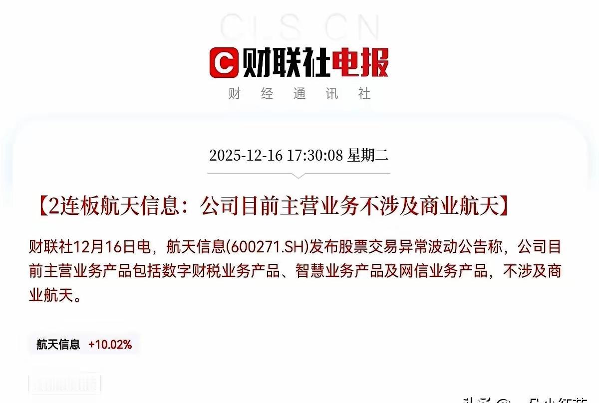这就是跟风炒作,航天长峰、航天信息和航天工程,结果人家直接说,主营业务与航天没有任何关系,啪啪啪直接打散户的脸,人家都不装了,一众散户估计脸都绿了,要干嘛去了,现在才说? 今天这三只股票铁定会全部跌停,哎,受伤的最后都是散户。