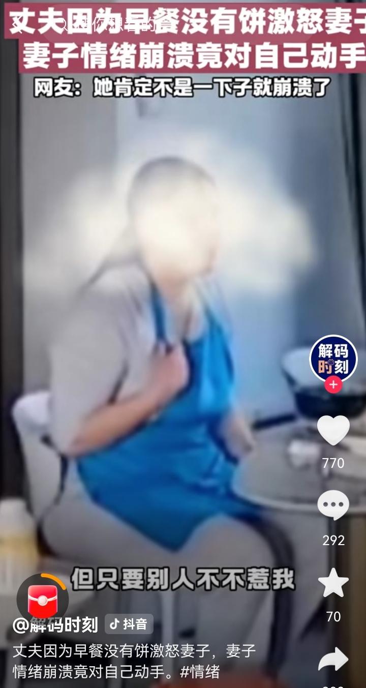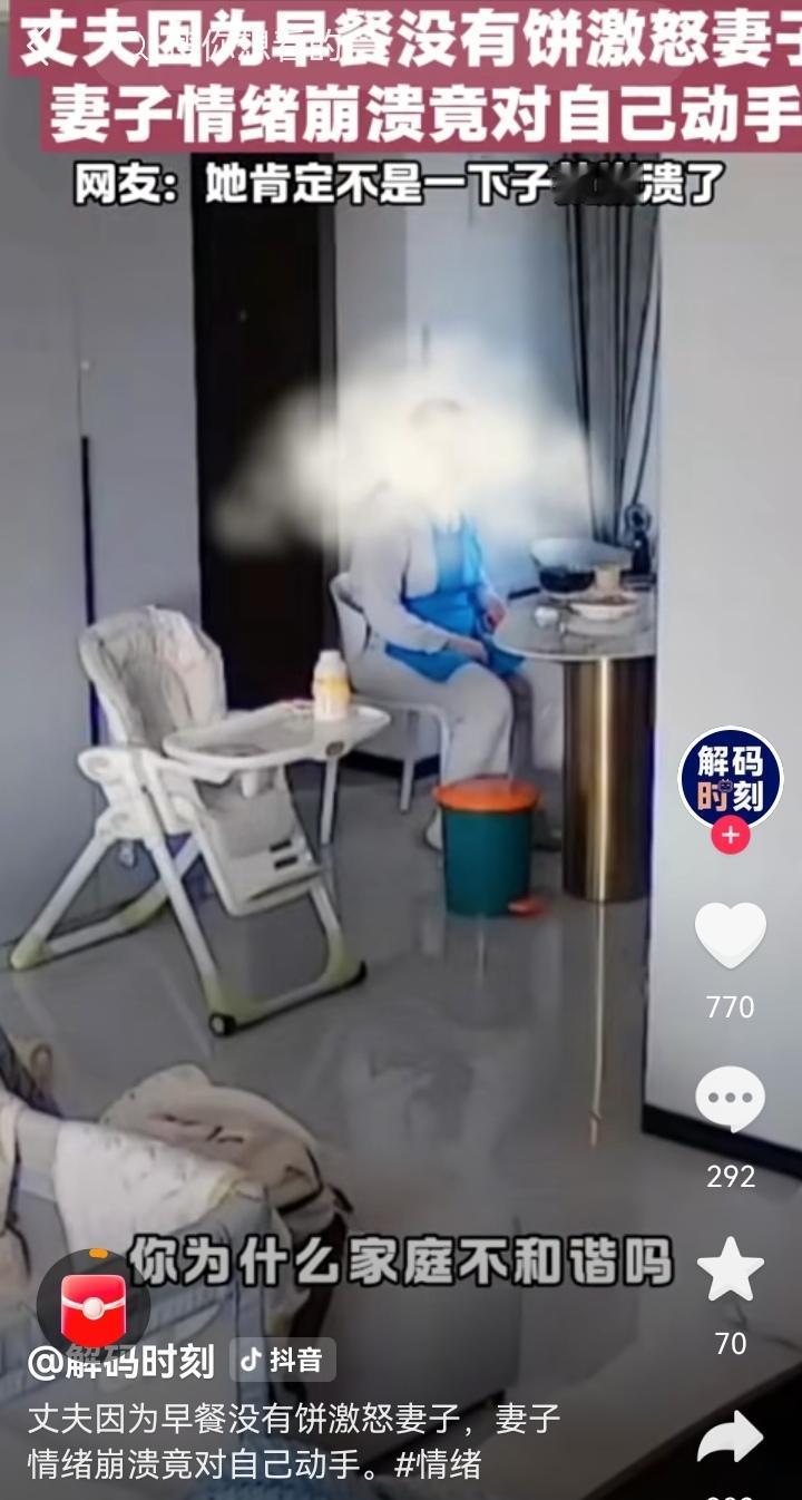 “这才是婚姻真正的悲哀!”妻子早起做好早餐,等丈夫一起吃。谁知丈夫一看,立马拉着脸说:怎么没做饼?! 有句话说的好:打败婚姻的从来不是大风大浪,而是柴米油盐里的一地鸡毛。 见过太多失败的婚姻,根本不是出轨或三观不合或犯了什么不可饶恕的错,就是一句话,一个小事,把人折磨崩溃了。 刚刚看到一个视频,更加顿悟这个道理 一妻子天不亮就起床给全家做早餐,忙忙碌碌了一个早上,满满当当做好了一桌子。然后,围裙也没有来得及摘,就坐在餐桌前等丈夫一起吃饭。 不过,让她没想到的是,丈夫起床后,来到餐桌前一看,立马不高兴了,然后耷拉着脸说:怎么没做饼?! 丈夫的意思很明显:我想吃饼,你做的这些都不是我的菜! 但就这一句话,彻底让妻子崩溃了,她开始左右开弓的扇自己的脸,每一下都很用力,带着委屈,带着愤怒。 试想一下,现在是大冬天,谁早上不想舒舒服服的在被窝里睡懒觉呢?!可这位妻子早上起来了,还给家人做早餐。 所以,不管做的如何,做的是什么,这份心意就很难得!你不说辛苦了,不心疼妻子的付出。反而是抱怨和指责,这谁能受的了呢?! 所以,妻子一边打自己一边对着丈夫哭喊:你到底想不想离婚,确定好了,我们现在就去! 面对妻子的歇斯底里,丈夫不但没有安慰和低头,反而顶着风来,说了一句:确定好了,离婚! 女子一听,把手上的手机啪的一下拍在餐桌上,然后站起身就说:走,离婚! 可谁知,这时丈夫又立马怂了,说了一句:没确定好,然后抱着孩子就离开了客厅。 这时,妻子再也绷不住了,又接连狂扇了自己几巴掌,边扇边说:我知道自己脾气不好,但只要别人不招惹我。你为什么婚姻不和谐?你为什么天天要过嘴瘾?! 看到这一幕真的觉得好无奈好悲哀!婚姻的不幸可能就是这样:你不理解我的委屈,我看不见你的付出!两人在一起,除了抱怨就是指责! 也有的网友说,看到这个妻子就好像看到了自己,自己辛辛苦苦,为了这个家省吃俭用,工作也辞了,然后像个保姆一样的伺候老的伺候小的,还要照顾老公。日复一日年复一年的生活琐碎,做不完的家务,教不完的作业,捡不完的玩具,吵不完的家,最后把自己折磨崩溃了,别人还觉得我不可理喻,像看怪人一样的看我,还成了大家都讨厌想逃离的人! 其实,让人崩溃的根本不是哪一件小事,而是日积月累的不被理解,年复一年的辛苦劳累,那被忽视的委屈。 就像网友说:她肯定不是一下子就这样崩溃的! 最后想说的是,婚姻里最寒心的从不是啥大吵大闹,而是我掏心掏肺为家忙活,你却挑三拣四、半点不领情。 老话常说:压垮人的从来不是千斤重担,而是一根又一根的稻草。 寒冬清晨妻子早起忙活一桌子早餐,换来的就一句“咋没做饼”,她扇的哪里是自己,分明是攒了太久的委屈和失望。 其实,真的,女人的崩溃从来不是一时上头,而是日复一日的家务操劳没人看见,是真心付出全被当成理所当然,是所有辛苦最后只换来苛责与挑剔。 要知道,过日子从来不是一个人的单打独斗,而是互相心疼、彼此包容,多念对方的好、多懂彼此的难。 唯有如此,才能把鸡零狗碎的日子,过成有滋有味的烟火幸福。 在我家,我们从来不起床特意做早餐,要么买着吃,要么简单煮个鸡蛋热个牛奶,老公孩子都觉得挺好。 再者,我家做饭这事儿,向来是,谁做饭谁做主,不做的别瞎BB。好吃多吃两口,不好吃,就少吃两口。为这个闹矛盾,真的浪费时间和感情。 对此你怎么看? 你会早起给家人做早餐吗? 做好了家人挑剔你会怎么处理呢?欢迎评论区留言讨论。
