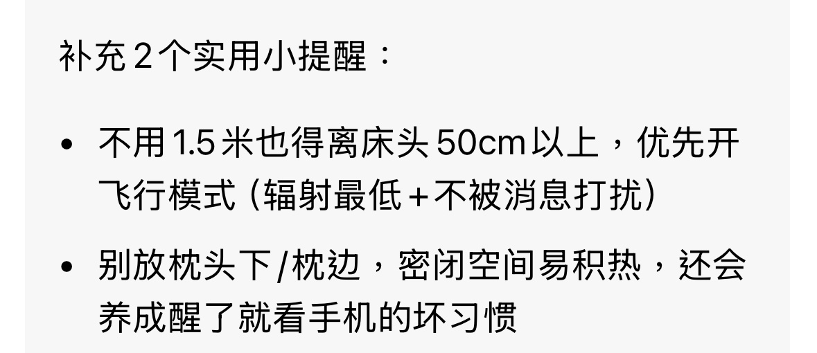 睡觉时建议把手机放在1.5米外似乎现在生活各处都有辐射晚上睡觉还是不要把手机放在枕边比较好。小时候大人就爱说不要靠电子屏幕那么近有辐射