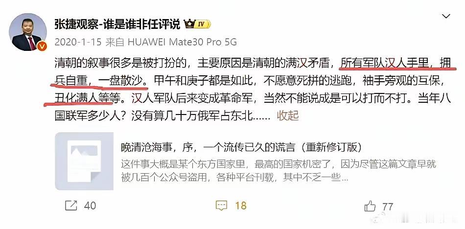 网友考古某大V曾经的言论,三张图时间跨度十几年,最早的图一是2012年11月6日,这史观着实不敢苟同! 图一中博主所言的“太平邪教”、“流寇”,结合前后文的理解,应当是指“太平天国”和“义和团”吧? “义和团”姑且不说,但是太平天国运动的“金田起义”可是被雕刻在纪念碑上的。作为一个熟稔历史的大V,“孔子奖章专家学者委员会主任委员……”,对被肯定为“体现中国人民反抗压迫斗争精神”的农民运动,这样评价实在不敢苟同! 对于历史人物的功过是非,不同人有不同的看法这很正常,但不必动辄扣帽子。正如图一博主所标注的那样“谁是谁非任评说”,既然如此,大家不妨观后自行判断,在评论区畅所欲言!