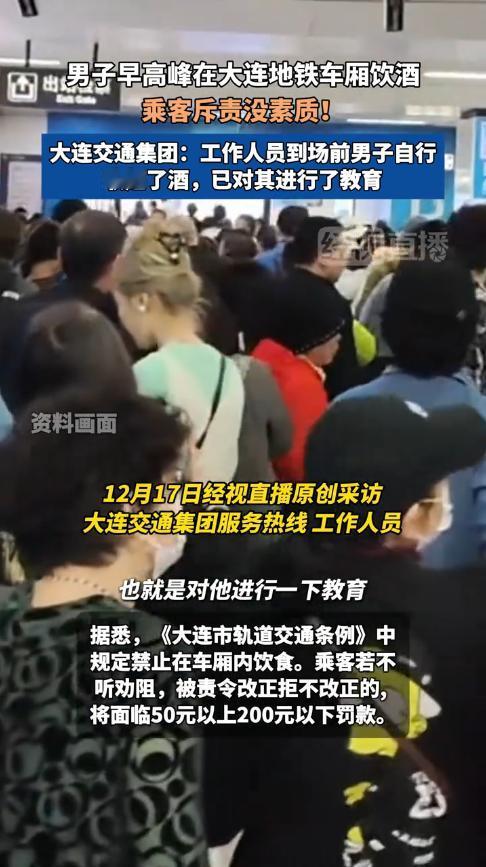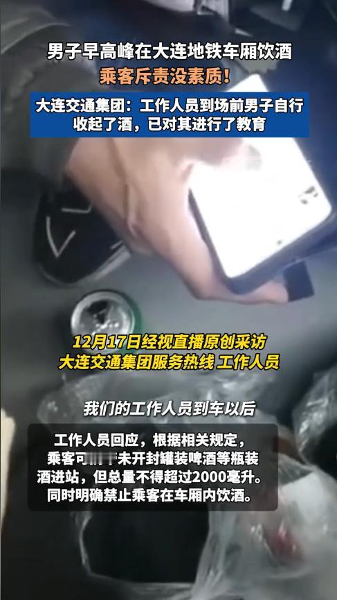 “太缺德了!”12月17日,辽宁大连,一男子坐地铁时,竟然掏出一罐啤酒,蹲在地上喝了起来,完全不在乎周围人的目光。等到工作人员巡逻过来,男子主动收起了酒,这种情况,工作人员也只能进行教育。网友:怎么带上来的? 在公共场合时,需要遵循相关的秩序,不然很容易造成事故,而在地铁上,是有明文规定不能饮食的,早上上班时,不少人为了赶地铁没时间吃饭,但是也不能在车厢内吃。 当天早上,正值早高峰时段,女子费了好大的力气才挤上车厢,过了一会儿,一名男乘客见这边有空就走了过来。 只是令女子没想到的是,这名男乘客竟然从包里掏出一瓶罐装啤酒,随后就在周围人震惊的目光中,自顾自的喝了起来。 过了一会儿,有工作人员过来巡视,发现了这名男乘客,很显然人家知道这样是不对的,立即收起了啤酒,没有办法,工作人员只能教育了他一会儿,就继续巡逻了。 咱们都知道,地铁车厢相对密闭,吃东西的话味道很快就传播到其他乘客那里,万一人家也饿着肚子,这不就容易起冲突了吗,再说了万一食物掉在地上,被乘客踩到摔倒,那该多冤啊! 所以大家一定要遵循制度,不要在车厢内吃东西。 信息来源:《男子早高峰在大连地铁车厢饮酒乘客斥麦没素质!》经视直播