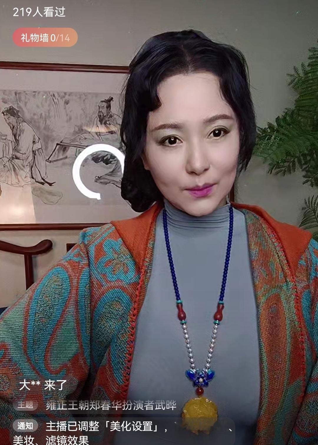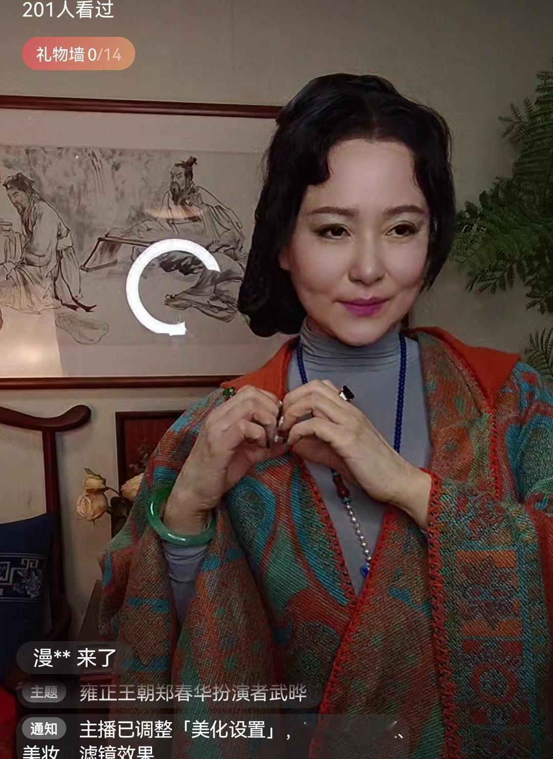 美人迟暮,《雍正王朝》第一美人儿郑春华也老了! 众所周知,雍正王朝是一部男人的戏,该剧诞生了一大批男性经典人物,比如冷面王胤禛,侠王胤祥,廉亲王老八,太子胤礽等。 虽然这是一部男人的戏,不置可否,剧中的女性人物同样不可或缺,她们表现同样非常出彩,让人印象深刻。 思来想去其实也就那几个角色,分别乔引娣,年秋月,苏舜卿,翠儿、阿兰和红袖招等。毋庸置疑,该剧所有女演员最受大家喜欢的肯定是郑春华,她也是公认的《雍正王朝》第一美人儿。 郑春华扮演者叫武晔,当时饰演这个角色时她只有20岁左右,该说不说,剧中的她演技精湛,有着与年龄不相符的成熟。 只可惜,当时的武晔并没有凭借郑春华这个角色红起来。虽然一直身在演艺圈,但是作品拍摄的作品大都是配角。据她说:近一部作品只在剧组待了15天,估计戏份也不是太多。 闲暇之余,武晔经常现身直播间。同之前不一样,昨天的她直播时并没有开美颜。 有目共睹,没有开美颜的武晔变化很大,脸部僵硬,苹果肌突出,法令纹也很深。其实,今年的武晔只有四十五六岁,这样的状态不能说太好。 大家请上眼,再看看她的手,皮肤黝黑,手指粗壮,这样的一双手跟女性那纤纤细手差距还是挺大的。 有一说一,现在的武晔已经今非昔比,完全看不出当年剧中那个妩媚迷人,含情脉脉的郑春华了。美人迟暮,我们的女神也老了!