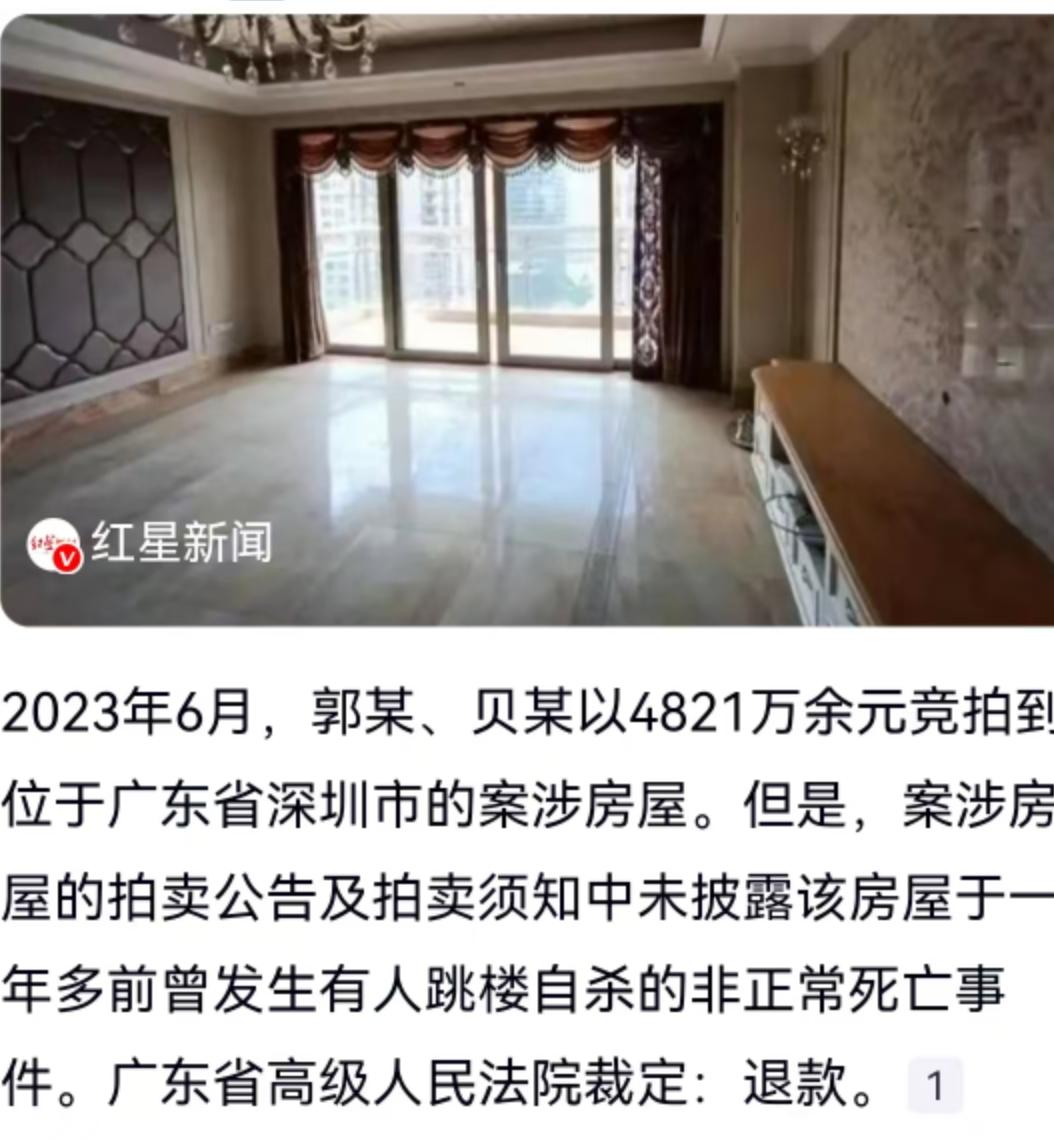 2023年6月,郭某、贝某掏出4821万余元,在深圳拍下了一套复式住宅。本以为捡了个宝,结果发现这房子一年多前有人跳楼自杀。拍卖公告和须知里压根没提这茬。两人一纸诉状告到法院,广东高院最后拍板:退款! 这事儿在圈子里炸了锅。1759人参与投票,七成多认为法院该退钱,毕竟“凶宅”这事儿膈应人。揭阳中院一审还搬出“法拍房风险自担”的老规矩,硬是把请求给驳了。可广东高院复议时态度很硬:房屋内非正常死亡属于重大心理瑕疵,不披露就是信息披露义务没尽到,买家完全能以“重大误解”撤销拍卖。 翻翻卷宗,这房子是2021年11月出的事,原居住者从楼上跳下。郭某、贝某咬死一点:买这房子是为了住,不是当“鬼屋”供着,关键信息藏着掖着,购房目的直接泡汤。法院这次站了买家,要求全额退款。 评论区里吵翻了。有人说“23年中买在山顶上”,暗示房价跌得厉害;有人算账:“4800万在深圳能买啥?拍卖价都这么疯?”还有人较真:“跳楼不是死在楼下吗?跟房子有啥关系?”更多人在吐槽:“买家自己没调查清楚也有责任”“法院披露不全常事,这次算较真”。 其实这类案子全国不少,但结果天差地别。有的法院认“凶宅”算瑕疵,支持退房;有的觉得“死者为大,活人别矫情”。广东高院这次明确把心理瑕疵摆上台面,算是给法拍市场立了条新规矩:房子有没有“鬼”,必须说清楚! 郭某、贝某拿回钱是小事,这事儿背后是法拍房透明度的老问题。拍卖公告里藏着多少“坑”?买家怎么避雷?法院披露义务的边界在哪?这些问题不解决,下一个“凶宅”纠纷迟早会来。 深圳的房价一直像个谜,4800万的复式听着就唬人。可再贵的房子,一旦贴上“凶宅”标签,立马掉价。有人调侃:“50万我买了”“转身一半就够了”。玩笑归玩笑,真轮到自己头上,谁心里不发毛? 这案子给所有法拍参与者提了个醒:拍前多留心,公告逐字读。要是法院藏着掖着,别怕闹到法庭。毕竟,谁也不想花几千万买个“心里别扭”回家。 以上内容仅供参考和借鉴