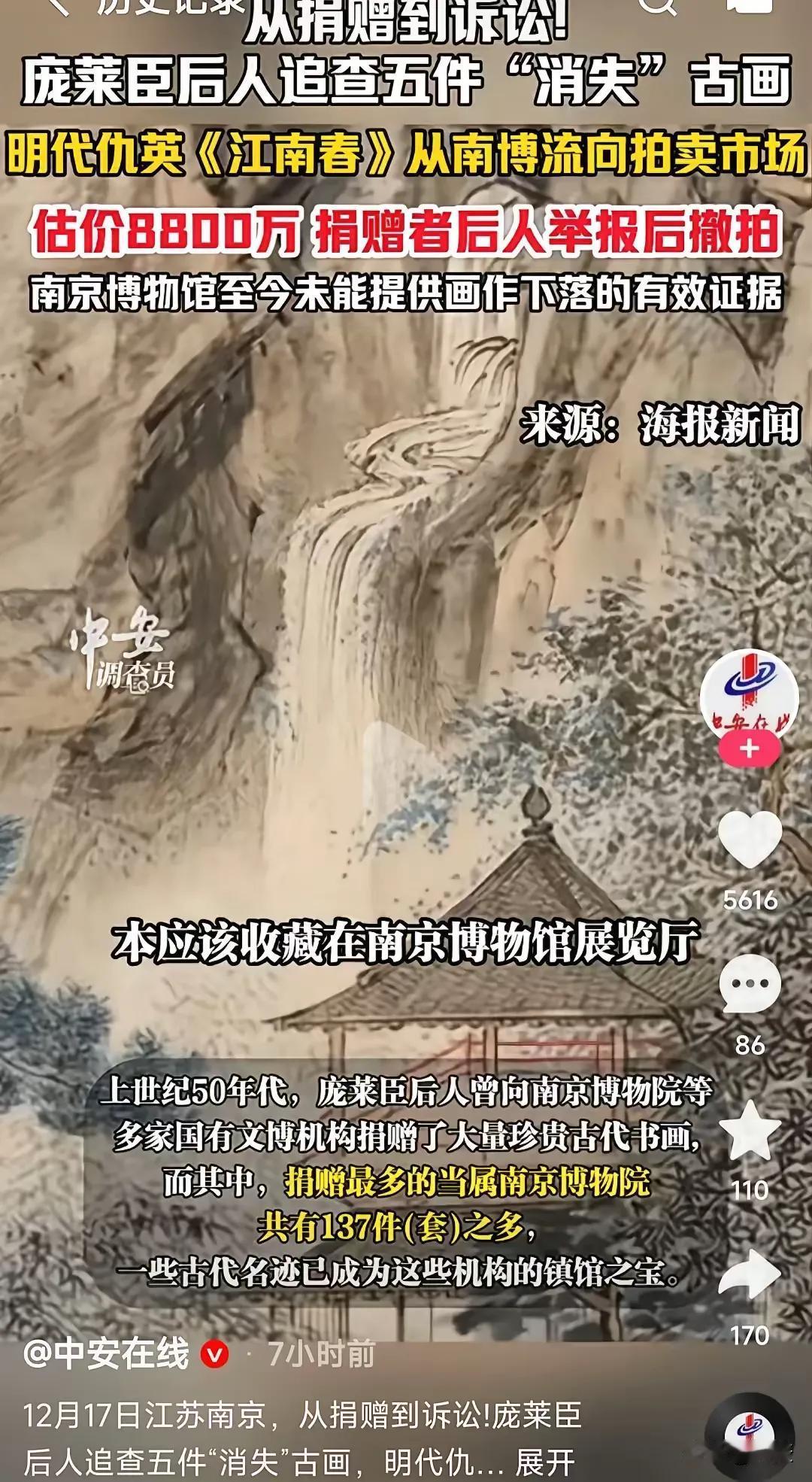 惊天大瓜! 捐赠人所捐的古物中竟少了5件古画,博物院称其为伪作,长达60年为什么到现在才说是“伪作”,博物院到现在拿不出鉴定书,也交代不了去向。而捐赠人手上保存当年的捐赠票据,上面清清楚楚记录着每一件藏品的信息。 这事从头到尾都透着说不通的地方。六十多年前,这些藏品是经过博物院专业鉴定后才被收下的,要是当时就认定是伪作,根本不可能纳入馆藏,更不会让捐赠人留下清晰的票据记录。 如今《春江图》流入市场估价达到8800万之高。最近恐怕全国各地的博物馆都要“起火了”。