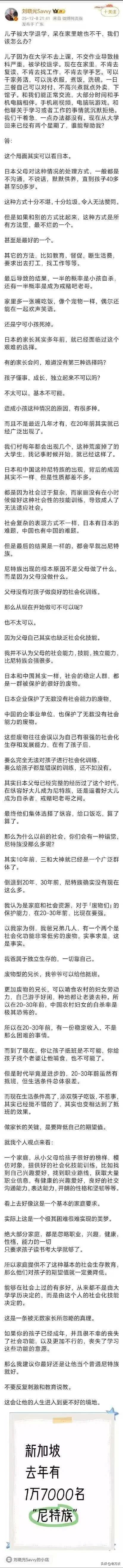 太可怕了,如果遇到这样的孩子,父母真不知道怎么办,特别是当父母老去或者过世之后,孩子怎么办?从大学回来之后,整天与手机、电脑为伴,不出去工作,不去社交,会偶尔做些饭或者点点外卖,对未来没有任何的规划,据说这样的人在日本有很多,在我们国内可能也有一部分,只是很少报道而已。如果家庭当中真的碰到了这样的小孩,父母怎么办?这些孩子不找工作,不考编,或者考了好多年都没有考上,仍然以考编为名义待在家里,不找朋友,不结婚,与父母一起生活,想想这样的生活都非常的可怕,特别是对于父母而言,好不容易把小孩子养大,难道还要把孩子养老吗!这种社会性的问题需要全社会想方设法来解决,否则不但影响家庭,而且也会影响国家和民族的健康发展。