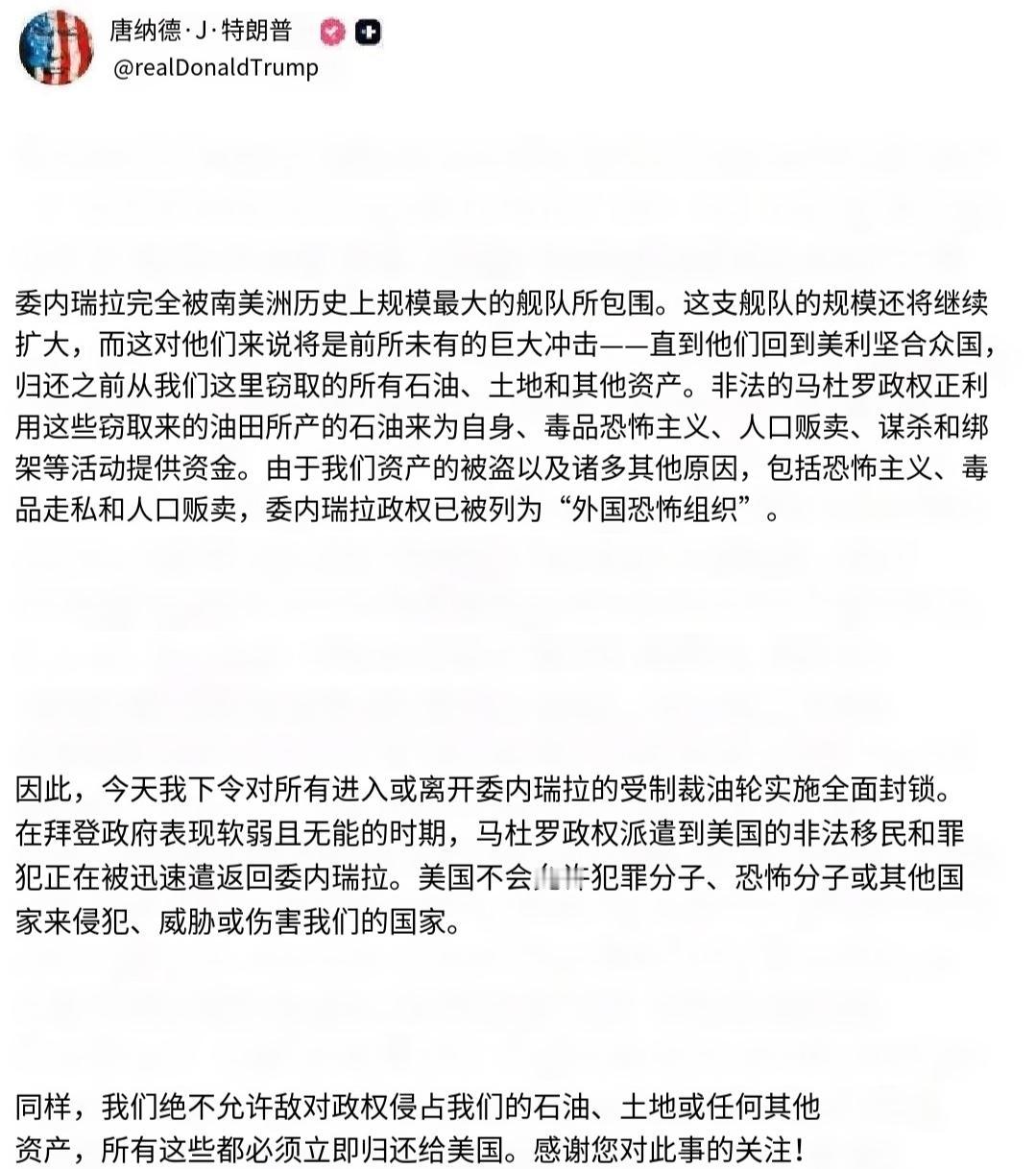 俄罗斯的影子船队能打破美军对委内瑞拉的封锁吗? 有报道称,PJ已派出属于影子船队的油轮前往委内瑞拉,有可能在加勒比海重演当年古巴导弹危机美苏对峙那一幕。舆论关注的是,已经公开宣布对委内瑞拉全面封锁的特朗普会允许俄船打破他的封锁吗?如果美军强行拦阻,PJ敢下令油轮强闯美军的封锁线吗?如果俄油轮强闯美军的封锁线,特朗普敢下令将其击沉吗? 俄集团要救马杜罗,必须有具体行动。当然政治支持也需要,比如中外长17日就向委外长打了支持电话。但援助最终还得落实在物质和行动上。 特朗普迟迟不动手,似乎再三犹豫,大概是在看东半球的反应,看委内瑞拉的朋友们有没有行动,有没有切实的行动,有没有管用的行动,特朗普在评估风险系数。他对俄集团还是怕的(他对俄集团有崇拜心理)。 换句话说,特朗普在窥探东半球援委救马的决心有多大。特朗普随时可能缩回去。 俄油轮到达加勒比海触到美军封锁线的那一刻,就是历史性时刻,就是时局的高潮。是骡子是马,谁公谁母,到那一天揭晓。