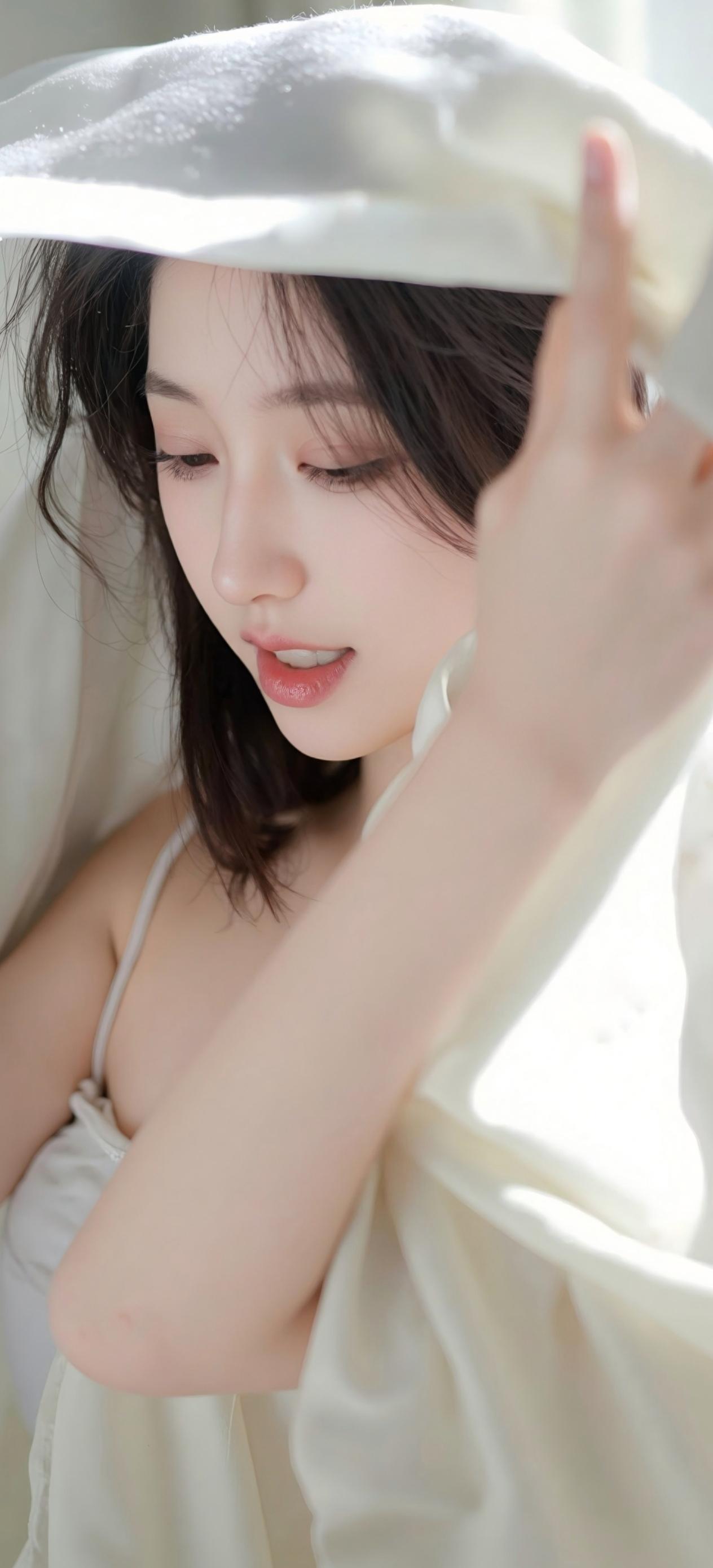 半掩轻罗睡眼朦,惺忪初醒态何慵。 微醺颊晕桃花色,似醉波横柳叶风。 一缕幽香迷蝶
