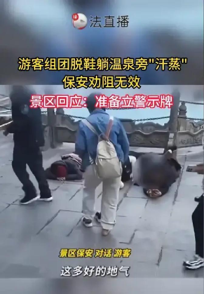 腾冲热海景区里,几位大妈把滚烫的地面当免费汗蒸房,脱鞋躺成一排,保安过来劝,反被推得往后踉跄。 视频里地表冒白汽,温度六十往上,她们垫条毛巾就敢贴上去,旁边游客吓得绕路。 保安小哥嗓子喊哑,只说“会烫伤”,大妈回一句“又不犯法”,手直接往人胸口顶。 景区后来补了围栏,可大家心里都清楚,拦得住地热拦不住任性。 门票钱买不来常识,真把公共地方当自己客厅,别人看着心惊,她们还嫌多事。 出来玩先学会尊重规则,别让一次任性毁了风景,也给自己留疤。