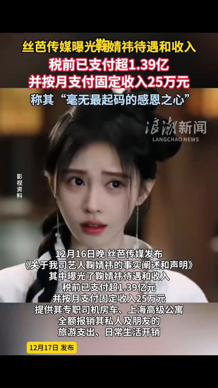 丝芭传媒曝光鞠婧祎待遇和收入,税前已支付超1.39亿,并按月支付固定收入25万元,称其"毫无最起码的感恩之心"。 浪湖新闻。 12月15日,丝芭传媒起诉状称鞠婧祎合约至2033年引发热议。当天,鞠婧祎_Official发布声明,称因丝芭传媒存在多项违约行为,甚至伪造补充协议,因此艺人在2024年6月15日要求解除合约。 12月17日发布《关于我司艺人鞠婧祎的事实阐述和声明》,其中曝光了鞠婧祎待遇和收入,税前已支付超1.39亿元,并按月支付固定收入25万元。提供其专职司机房车、上海高级公寓,全额报销其私人及朋友的旅游支出、日常生活开销。还在声明中称,将其从素人培养成具有一定社会影响力的知名艺人,却毫无最起码的感恩之心。