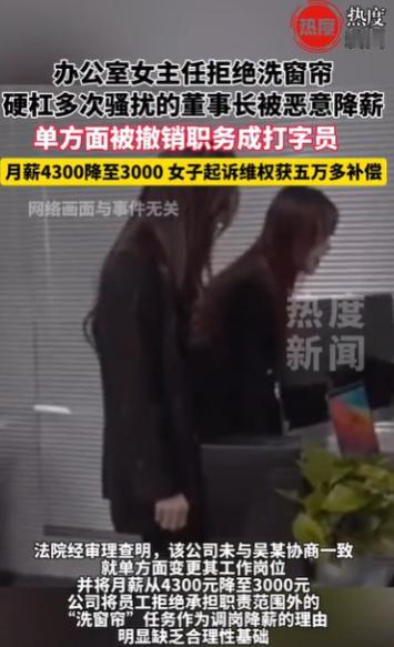 “色欲熏心?”湖北大冶,女子本是办公室副主任,董事长指定让她“清洗办公室窗帘”,女子果断拒绝,却被降职到打字员,4300元月薪也降到3000元,还招新人替代女子工作,甚至换了女子办公室的门锁,女子这个憋屈,因为董事长经常给她发骚扰信息,她多次明确拒绝,却遭董事长调岗降薪报复,女子一气之下告上法院,法院作出公正判决。 50463.22元,这是湖北大冶市法院递给吴女士的最终答案。 当判决书上“公司单方调岗降薪违法”的字样映入眼帘时,这场耗时近一年的职场纠纷,终于有了结局。 可谁能想到,引爆这场风暴的,竟是“洗窗帘”这件看似微不足道的小事,而判决书中未详述的证据博弈、沟通破裂细节,才是胜诉的关键。 法院的判决清晰地勾勒出时间线:2012年6月入职,2023年2月劳动关系解除,十一年工龄,从办公室副主任到打字员,月薪从4300元骤降至3000元。 这串数字背后,藏着一段充满报复与反抗的职场博弈,更藏着吴女士从恐慌到冷静、步步为营固定证据的全过程。 一切的转折,始于那通带着威胁的电话。 “你去把办公室的窗帘洗了。”2023年2月1日,董事长李某的指令让吴女士错愕不已。 洗窗帘本是清洁员张某秀的活儿,公司《岗位说明书》上白纸黑字写着她的职责是公章管理、考勤统计、档案归档,与清洁工作无任何交集。 更让她心头一紧的是,这并非单纯的工作安排——李某此前多次通过微信发送冒犯性信息,从“你穿裙子真好看”到“晚上单独出来聊聊”。 “这不是我的岗位职责,清洁工作有专门的同事负责。” 吴女士在电话中试图理性沟通,可李某的回应带着不容置喙的强硬:“公司安排的工作没有分内分外,你不做就是不服从管理,要么做,要么辞职。” 这句话像一根刺扎进吴女士心里,她立刻按下手机录音键,将整段通话完整记录下来——这段录音后来成为证明李某“报复动机”的关键佐证。 拒绝后的第2天,也就是2月2日,公司行政部突然通知开“临时专题会”,吴女士到场后才发现,会议主题竟是“撤销其办公室副主任职务”。 会上,总经理只笼统地说“为优化组织架构”,却拿不出任何书面依据,吴女士当场提出异议,要求说明具体原因并出具正式文件,却被人力资源总监打断:“这是董事长的决定,执行就行,不用多问。” 她下意识掏出手机录音,被行政部同事伸手阻拦,争执间,会议纪要已被匆匆宣读并散会,全程没有任何书面签字确认环节。 更离谱的操作还在后面。 2月9日,吴女士收到一份打印的《调岗通知》,没有公章,只有人力资源部的手写签名,上面写着“调任打字员岗位,月薪3000元,三日内报到”。 她找到人力资源总监理论,对方态度傲慢:“要么服从,要么按旷工处理,旷工三天自动离职。” 沟通无果的当天下午,吴女士发现自己办公室的门锁被换了,她拍了门锁照片和无法开门的视频,又联系物业调取了当天上午公司派人换锁的监控录像,这些画面后来都被提交给了法院。 让她彻底寒心的是,2月10日,她在公司内部招聘平台上看到了“办公室副主任”的招聘启事,要求“3年以上相关经验,一周内到岗”——这意味着公司早已在背后找人替代她,调岗只是逼迫她主动离职的手段。 吴女士没有慌乱,她截图保存了招聘信息,又整理出近一年的工资流水、社保缴纳记录,加上之前的微信聊天备份、通话录音、调岗通知照片、门锁监控,形成了一套完整的证据链。 她先是找到劳动监察大队投诉,提交证据时特意附上了《岗位说明书》原件,证明洗窗帘与自身职责无关。 由于双方各执一词,调解最终破裂。 庭审时的交锋更是激烈。 公司方声称调岗是“正常用工调整”,打字员岗位与原岗位“薪资差距不大”,还提交了伪造的“吴女士工作失误记录”,试图证明调岗的合理性。 但吴女士的代理律师逐一拆解:先是播放了通话录音,证明李某的威胁言论。 再展示了微信聊天备份的公证件(诉讼前吴女士特意去公证处做了电子证据公证),戳穿报复动机。 法院最终认定,公司调岗既无合理依据,又未履行协商程序,且存在更换门锁、隐瞒招聘等恶意行为,已构成“未按劳动合同约定提供劳动条件”,判决支付经济补偿金47300元及未休年假工资3163.22元。 这场看似荒唐的“洗窗帘风波”,终以吴女士的胜诉落幕,而那些她在恐慌中冷静固定的证据、据理力争的沟通场景,才是这场职场维权战的核心底气。 如果各位看官老爷们已经选择阅读了此文,麻烦您点一下关注,既方便您进行讨论和分享,又能带来不一样的参与感,感谢各位看官老爷们的支持!