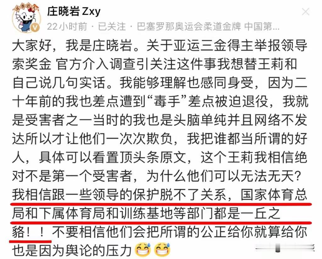 王莉举报范继文这事有新进展,奥运冠军庄晓岩出来力挺,直言体育圈这些藏着的破事早该摊开说。王莉这次直接拉出录音,把“自愿退役”的说法全推翻。她表示自己连退队材料何时递上去都不知,被“打磨”得身份没了、比赛机会没了。范继文还想拿走她亚运会金牌的国家奖金,不给就骂她“愚孝”。 庄晓岩也曾有类似遭遇,拿了奥运冠军后,因拒绝给教练分商业活动的钱,被教练打压,没比赛名额、进不了训练场,还被队友孤立。看来体育圈这些不公平现象,真该好好整治了。