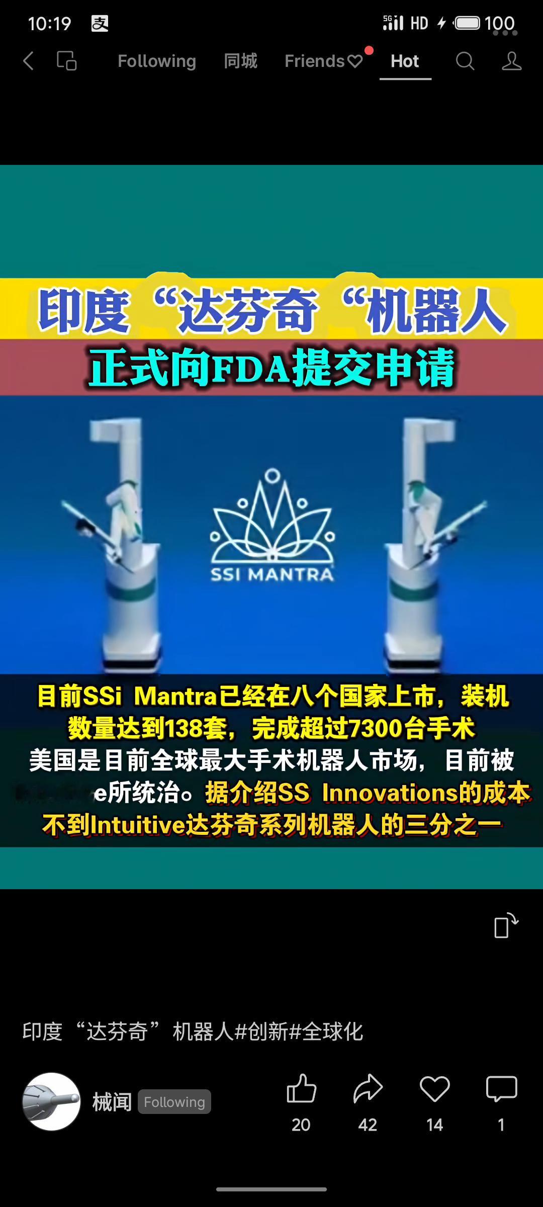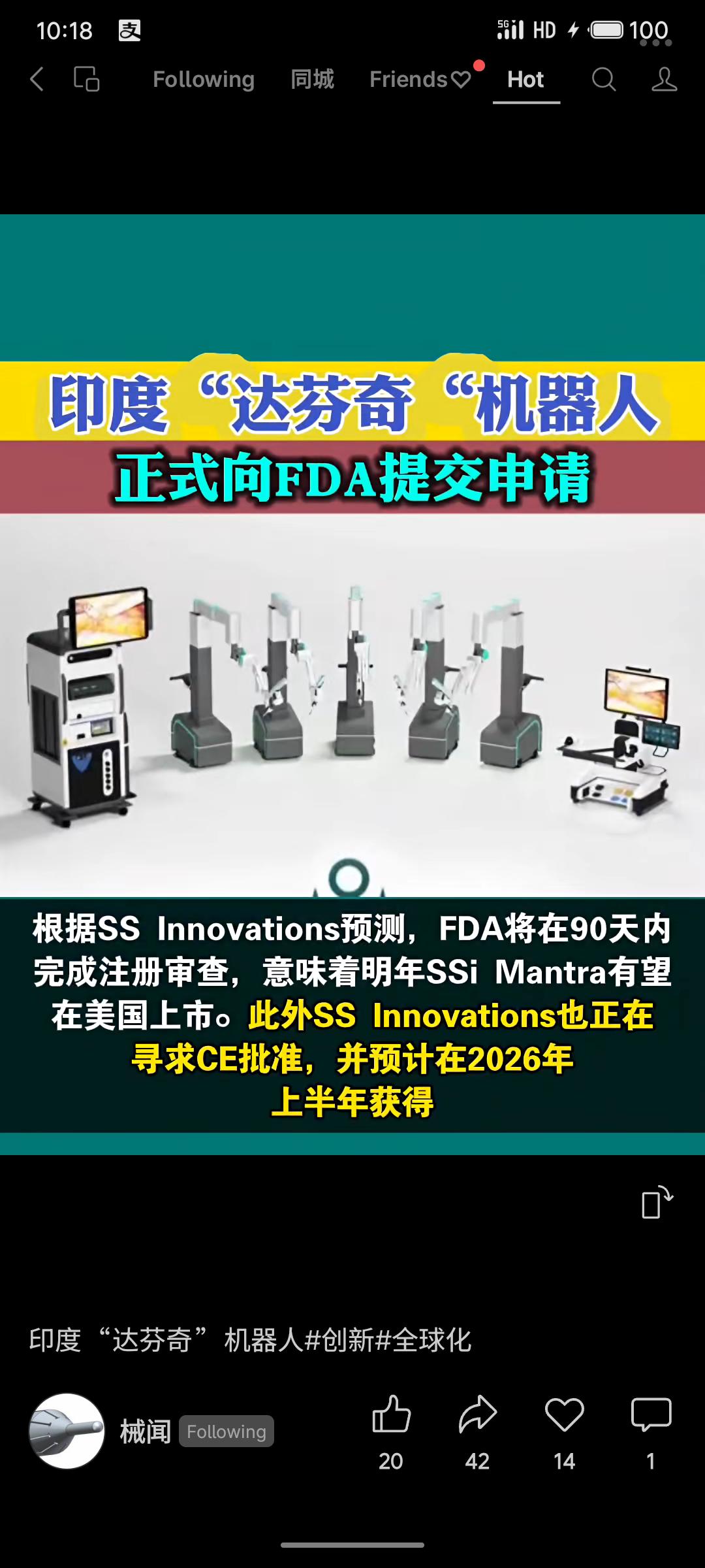 印度手术机器人公司SS Innovations正式向FDA提交其SSi Mantra的注册申请。该设备成本仅为市场主流产品“达芬奇”的三分之一,且预期覆盖的外科领域广泛,展现了印度在高端医疗设备领域的突破。若能获批进入美国市场,将有望打破现有垄断格局,是全球医疗技术多元化竞争的重要进展。