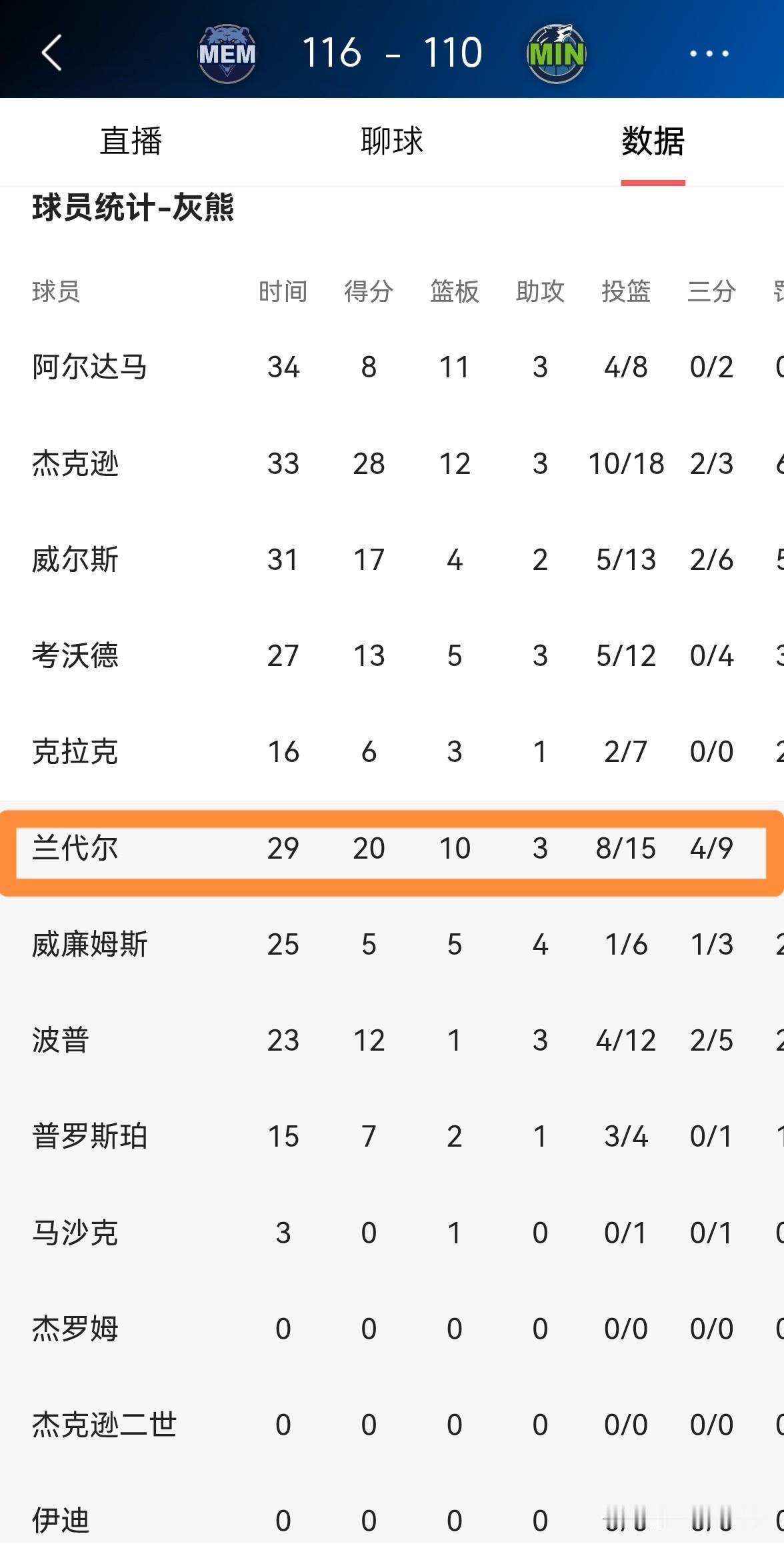 灰熊替补中锋兰代尔真是大发神威!在今天灰熊客场以116:110力克森林狼的比赛中,兰代尔打出了赛季最佳表现之一。 全场比赛下来,兰代尔替补出战29分钟,投篮15中8,其中三分球9中4砍下20分10篮板3助攻2抢断1盖帽,他的场上正负值为+19。 值得一提的是,在比赛的关键时刻,兰代尔用一记记三分球帮助球队稳定了胜局,兰代尔绝对是灰熊获胜的大功臣。