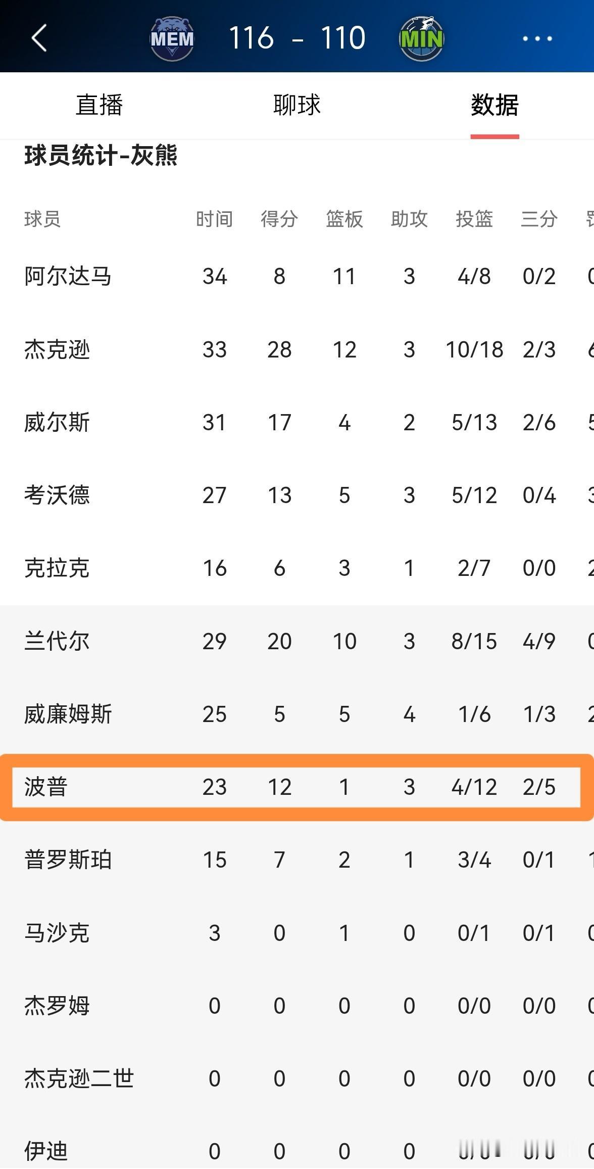 灰熊大将波普真是太反常了!虽然今天灰熊在客场以116:110击败森林狼,但是波普却一反常态打得非常低效。整场比赛下来,波普替补出战23分钟,投篮12中4,其中三分球5中2、罚球2中2非常低效的得到12分,还出现了3次失误。 众所周知,波普向来以投篮高效著称,不过今天的波普确实太反常了。