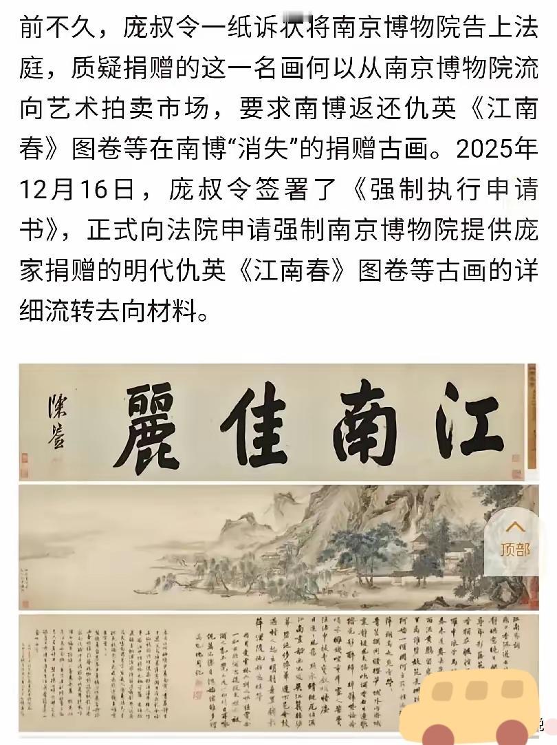 南京博物院这波“伪作甩锅”简直把公众当傻子耍!60年前庞家无偿捐137件“虚斋旧藏”,转头5件就“消失”,估价8800万的仇英古画都跑到拍卖行,南博却嘴硬说“是假的早处置了”。 搞笑的是,2014年还把这些“伪作”当宝贝办展夸“流传有序”,如今鉴定报告打满马赛克,连鉴定专家里都有非专业的工作人员。法律明明白白要求处置捐赠品得通知原主人,他们倒好,捐赠人后代要查验直接无视,被逼到起诉才肯回应。 这哪里是“调剂处置”,分明是借着“伪作”名头暗箱操作!博物馆守的不只是文物,更是公众的信任,连捐赠人的知情权都敢漠视,以后谁还愿意把传家宝交给国家?真相从来不是“打太极”能糊弄的,查清楚文物去向、补上制度漏洞,才是给所有人的交代!