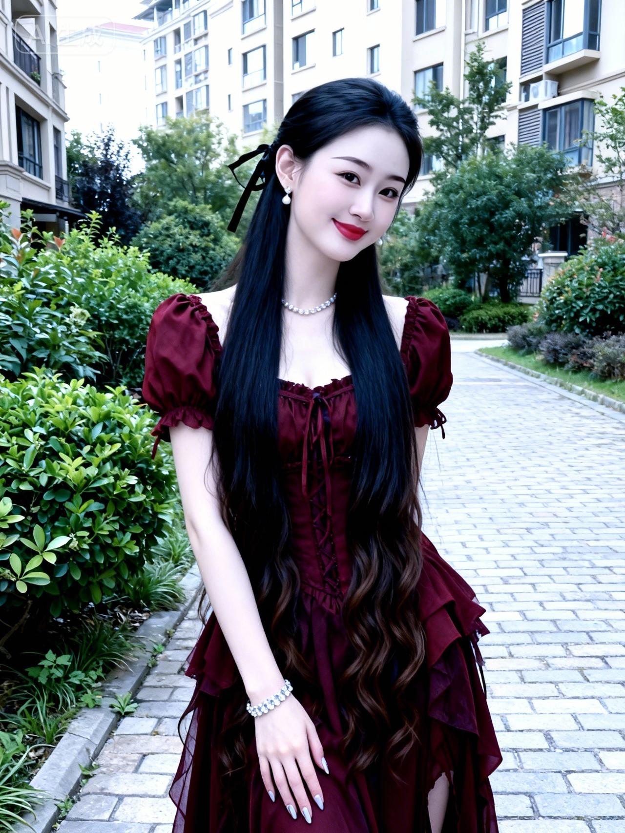 优雅红裙,绿意盎然,漫步在都市花园中。