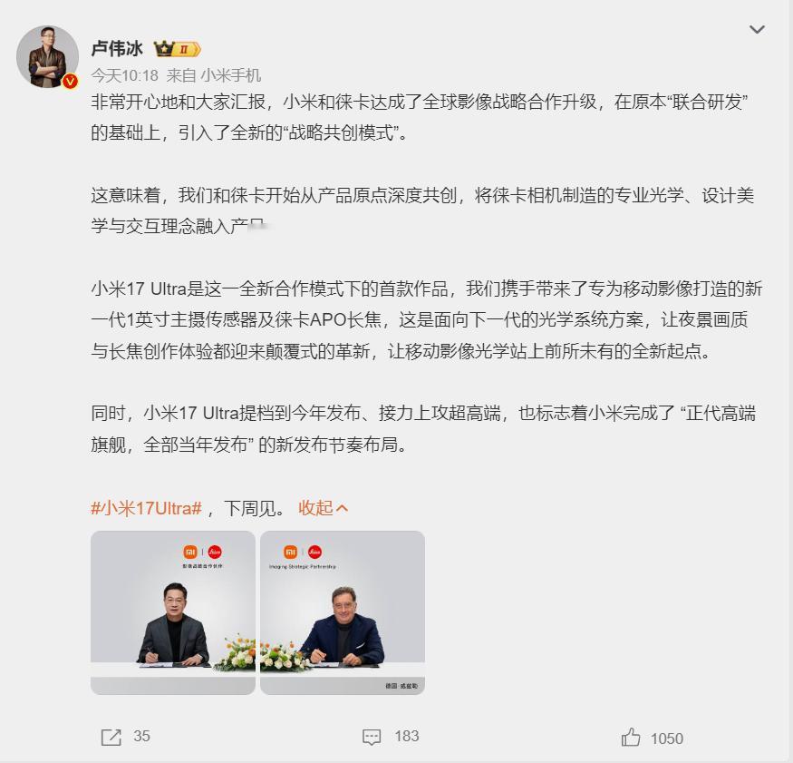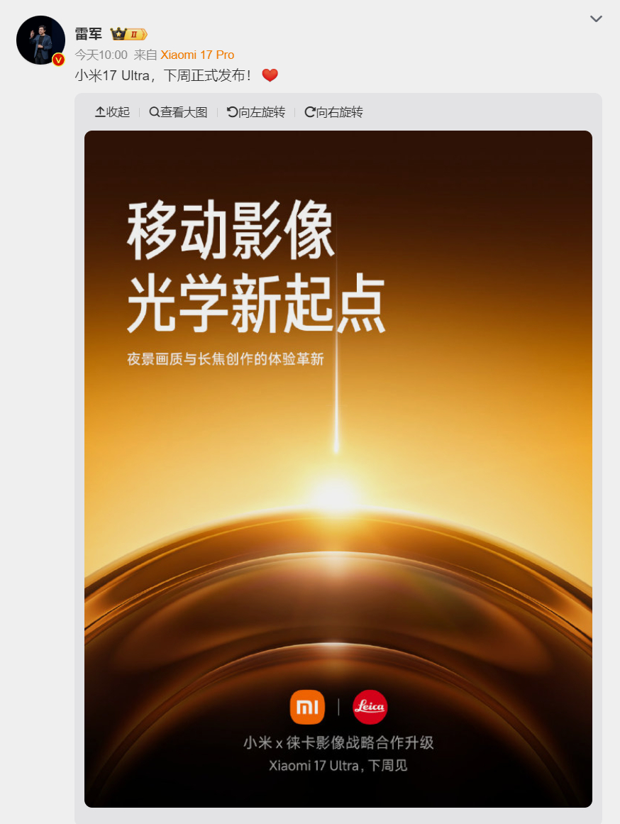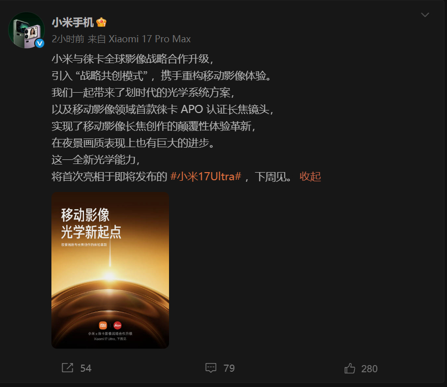 小米17Ultra发布时间定档 小米15 Ultra的发布时间是2025年2月27日。时隔仅10个月,小米17 Ultra就来了。话说这里面到底有什么“东西”,让这次迭代安排得如此紧凑?