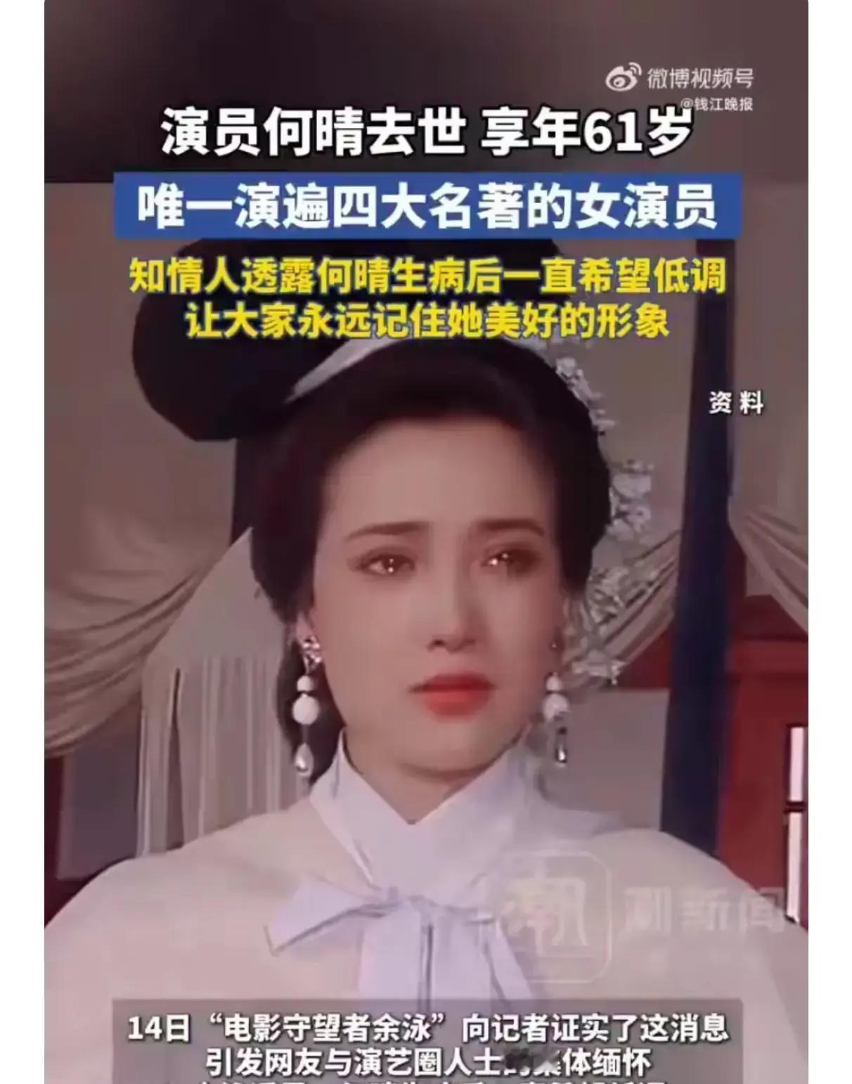 北京刚下完初雪,就传来噩耗:那位演遍四大名著的古典美女何晴,就这么悄无声息地走了,才61岁啊! 她从浙江昆曲团起步,早年意外被导演看中,拍了《西游记》里的怜怜,那双眼睛一眨,调皮又灵动,瞬间俘获多少观众的心。后来又接连拿下《红楼梦》里的秦可卿,娇弱中带着股子让人心疼的柔美;《三国演义》的小乔,温婉贤淑,一笑倾城;《水浒传》的李师师,端庄里藏着风情。她是内地唯一一个把四大名著经典角色都演了个遍的女演员,还被大家封为“古典第一美女”,那气质,干净清澈,像从古画里走出来的一样。 这些年她其实身体不太好,得了脑瘤,还中风过,治疗了好久,一直低调养病,从不对外抱怨。家属也尊重她的心愿,只在小圈子里发讣告,不想让大家看到她病弱的样子,就想留住她最美的模样。12月13日那天,她在北京安然离开,告别仪式也办得简单低调。 真心觉得可惜,这么好的演员,走得太早了。她的那些角色,陪着我们长大,现在还那么鲜活。希望她在另一个世界,没了病痛,永远保持那份干净的笑。那些经典形象,会一直留在咱们心里,时间再长,也不会褪色何晴照片 何晴古装戏 何心晴 何婉晴